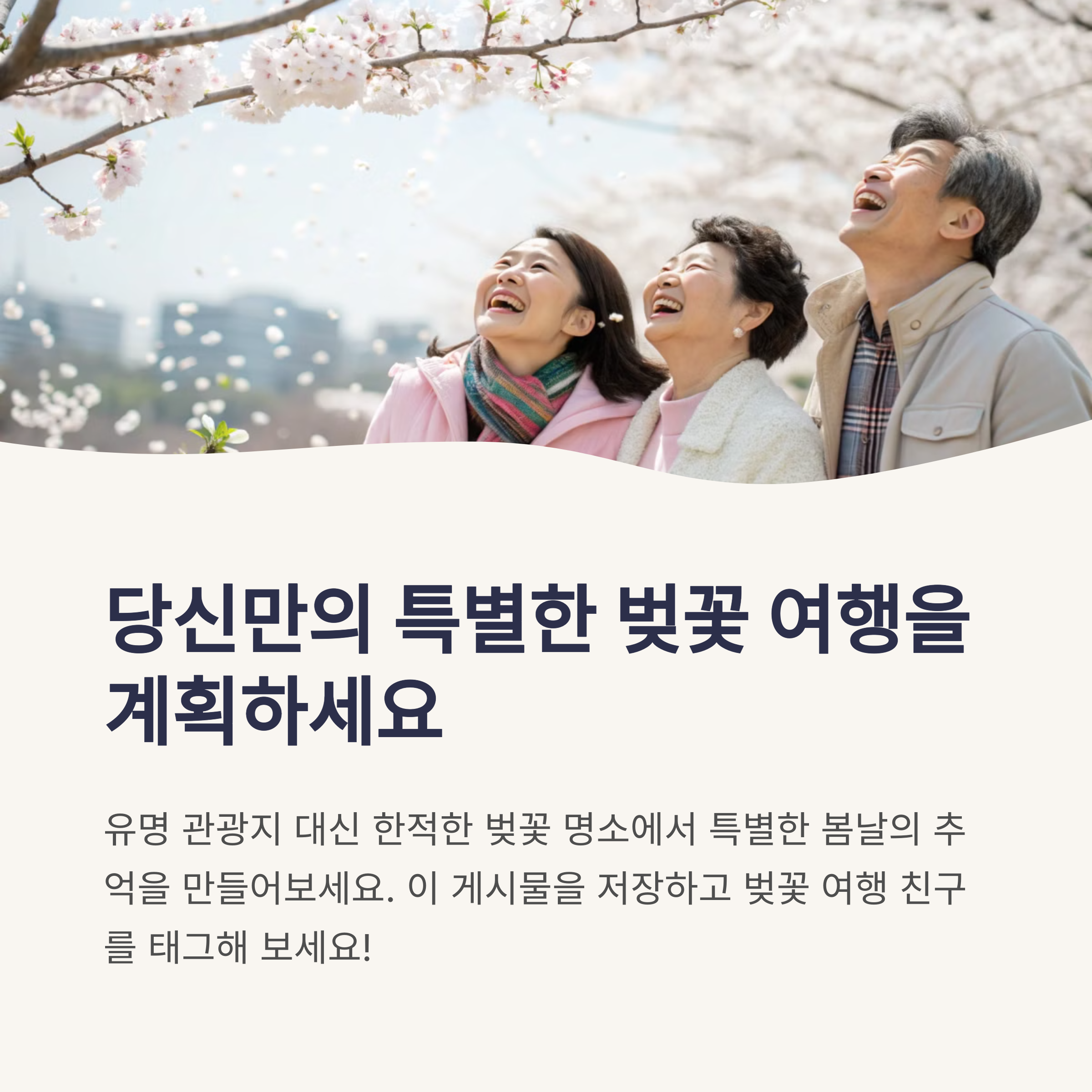 어느덧 다시 찾아온 봄, 거리에 퍼지는 꽃향기에 설렘이 더해지는 계절입니다. 벚꽃이 만개하는 이 시기, 많은 분들이 진해 군항제를 떠올리지만, 사실 우리나라 곳곳에는 진해 못지않게 아름다운 벚꽃 명소들이 숨어있습니다. 이번 글에서는 유명 관광지보다 덜 알려졌지만, 오히려 더 매력적인 벚꽃 여행지를 소개해드리려 해요. 붐비지 않는 한적함 속에서 여유롭게 꽃길을 걷고 싶다면, 이 글을 끝까지 읽어주세요. 특히 가족 단위 여행자나 연인, 사진 찍기를 좋아하시는 분들께 꼭 맞는 알짜 정보를 정리해드릴게요. 천천히 스크롤 내리며 2025년 봄을 제대로 즐길 수 있는 비밀스러운 벚꽃 스팟을 함께 알아봅시다.
