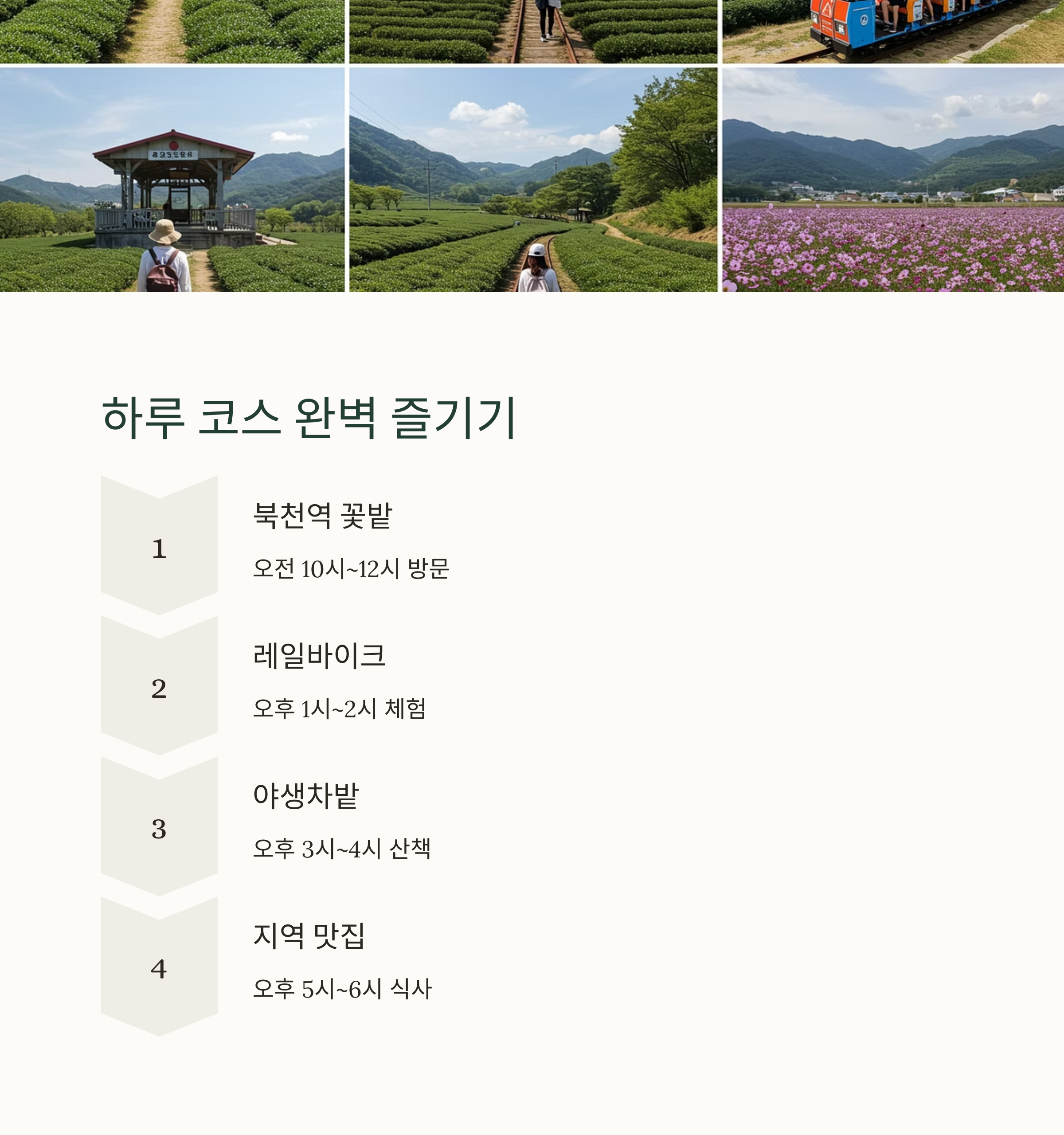 꽃밭 → 북천역 기차 카페 → 점심 → 녹차밭 → 섬진강 풍경
