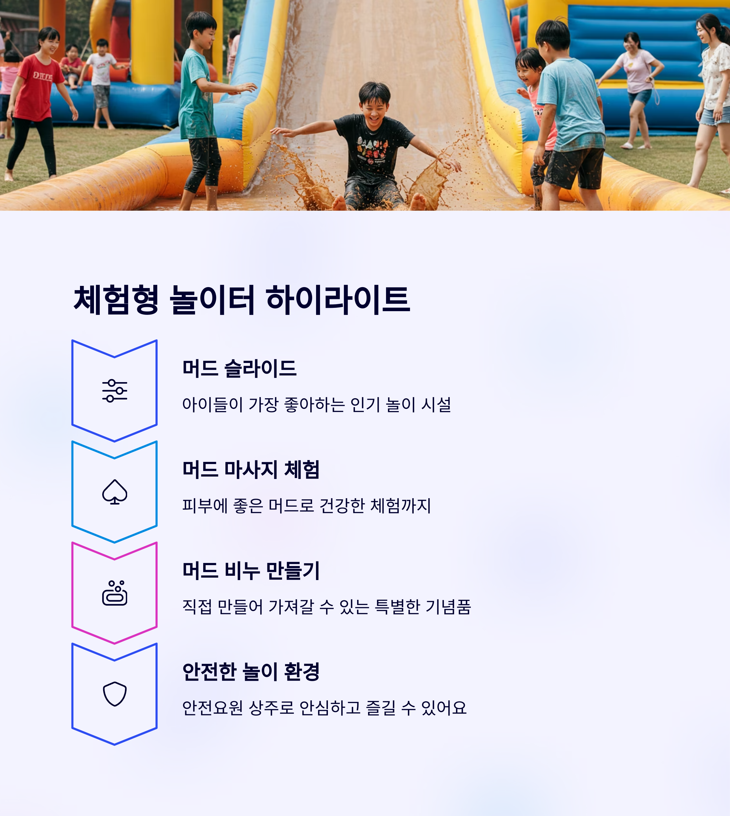 - 머드 마사지: 부모와 함께 체험 가능한 힐링 공간