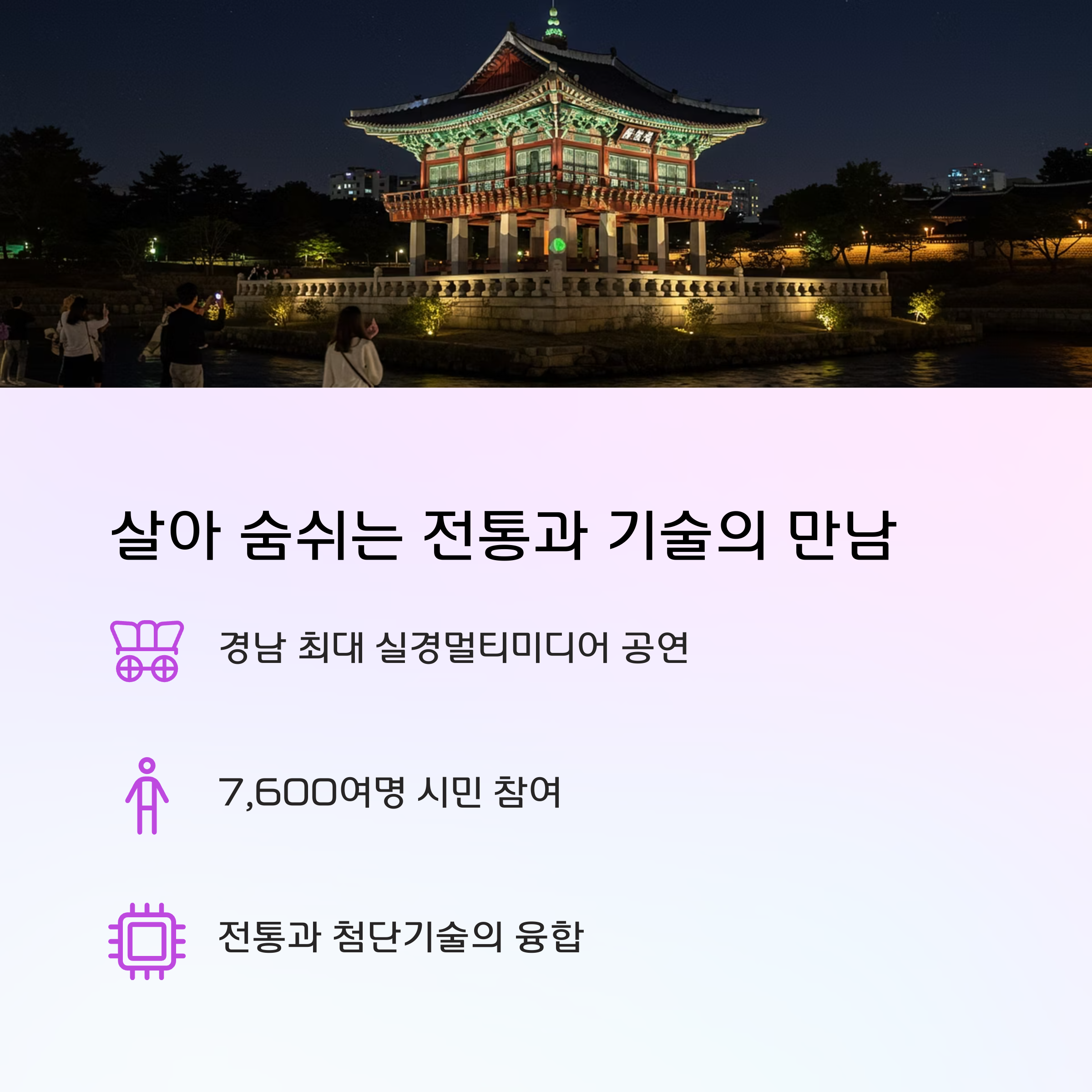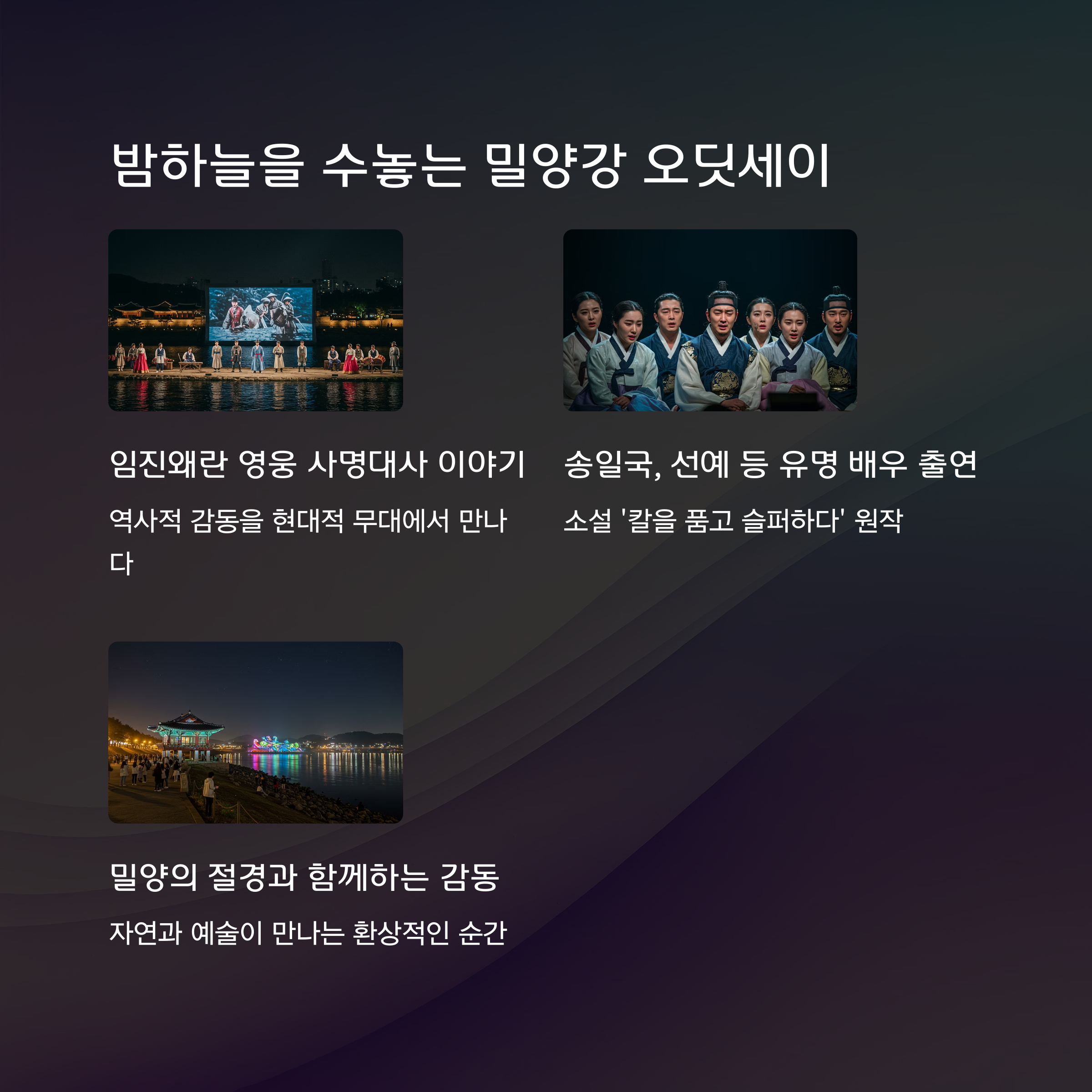 영남루와 밀양강이라는 유서 깊은 배경 위에 드론, 미디어파사드, 특수효과 등 최신 기술이 접목되어
