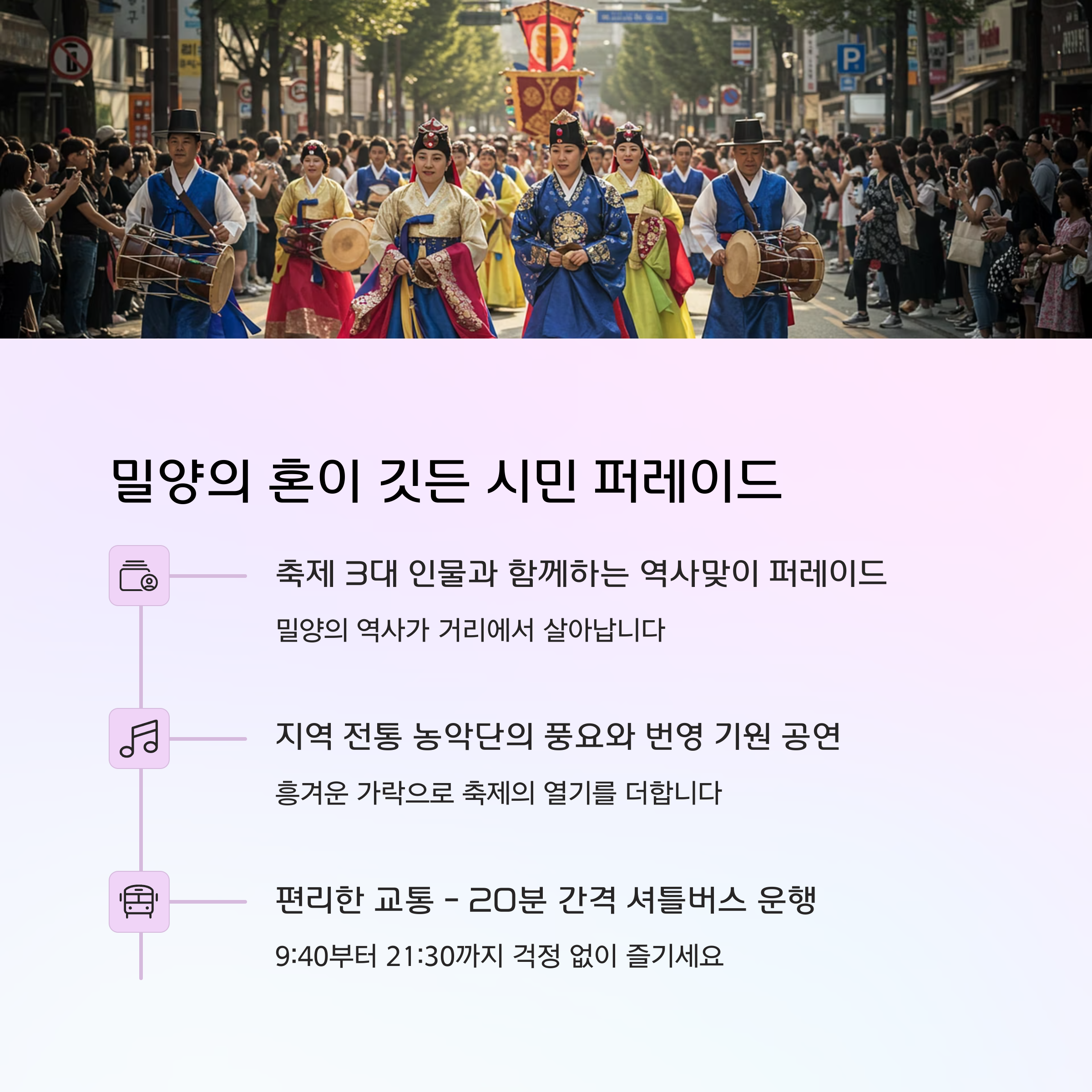 아랑 전설, 밀양 독립운동, 지역 민속 등 각종 테마로 꾸며진 퍼레이드는