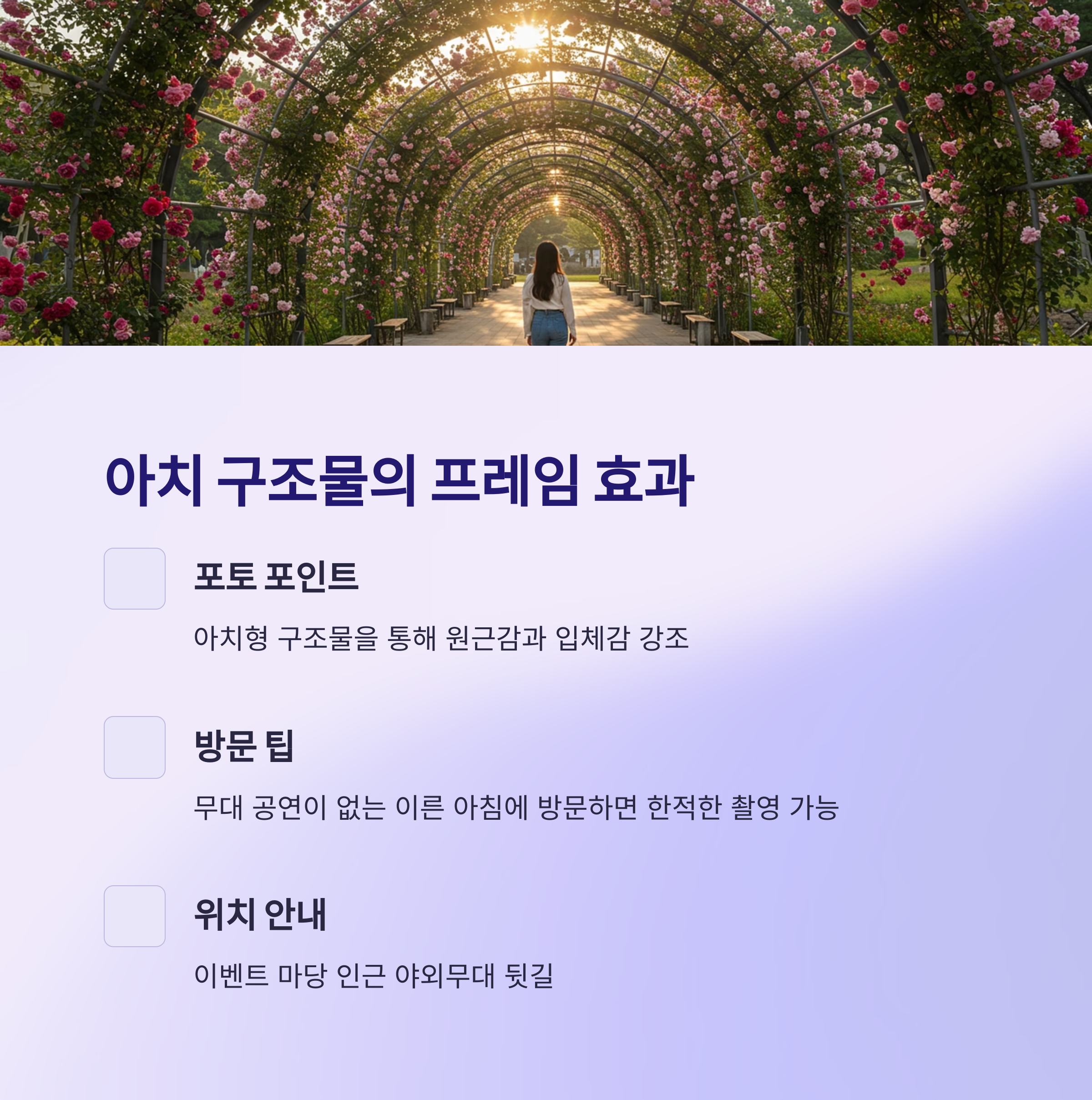 야외무대 뒤편에 위치한 장미 아치 구조물은 오전 시간대 방문이 핵심 포인트입니다.