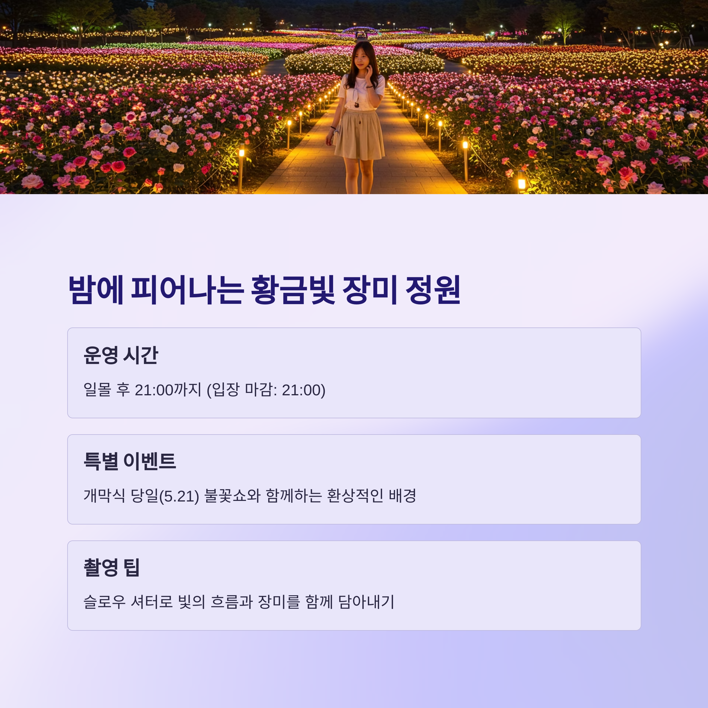 황금빛 조명이 길게 이어지는 꽃길은 야경 인생샷 명소로 꼽힙니다.