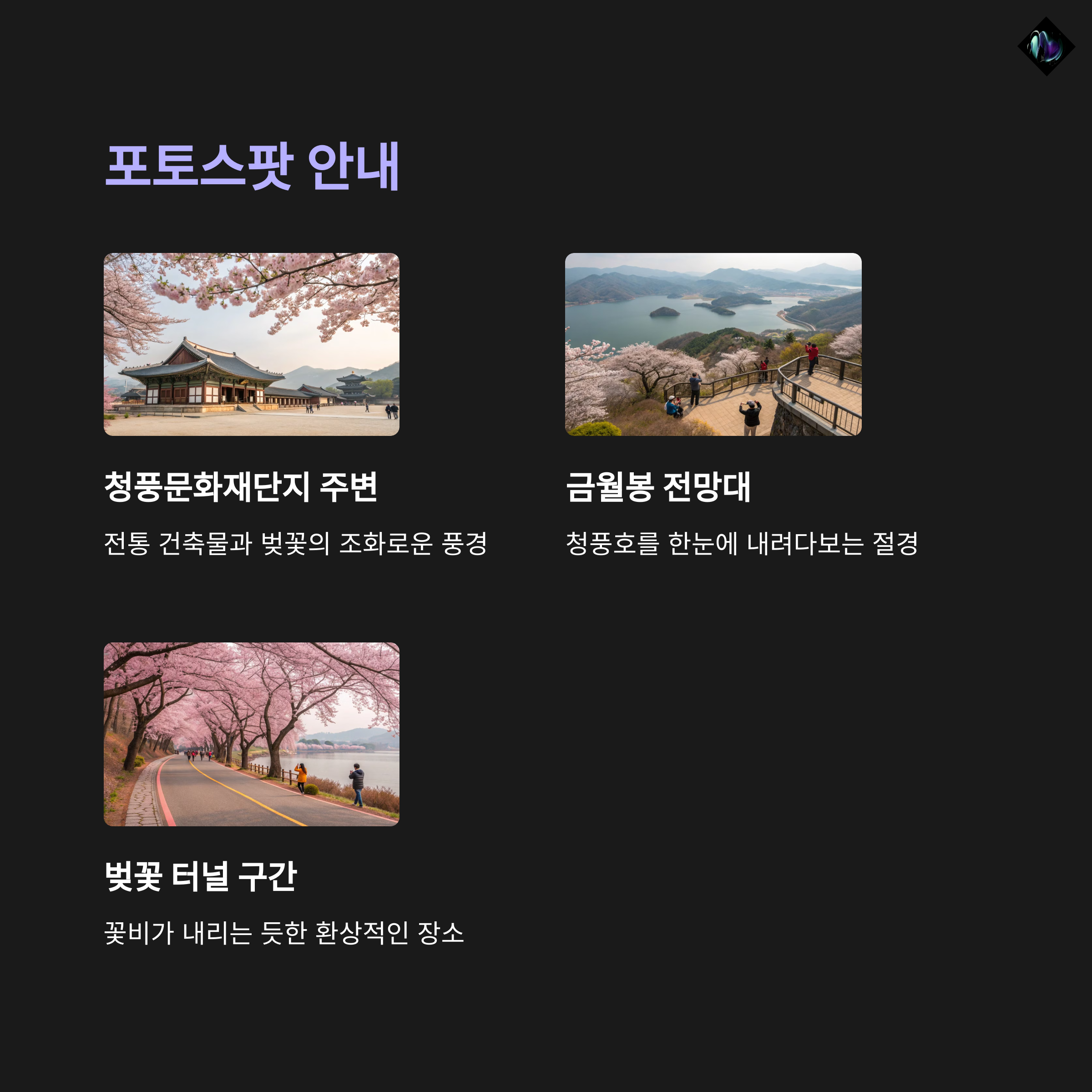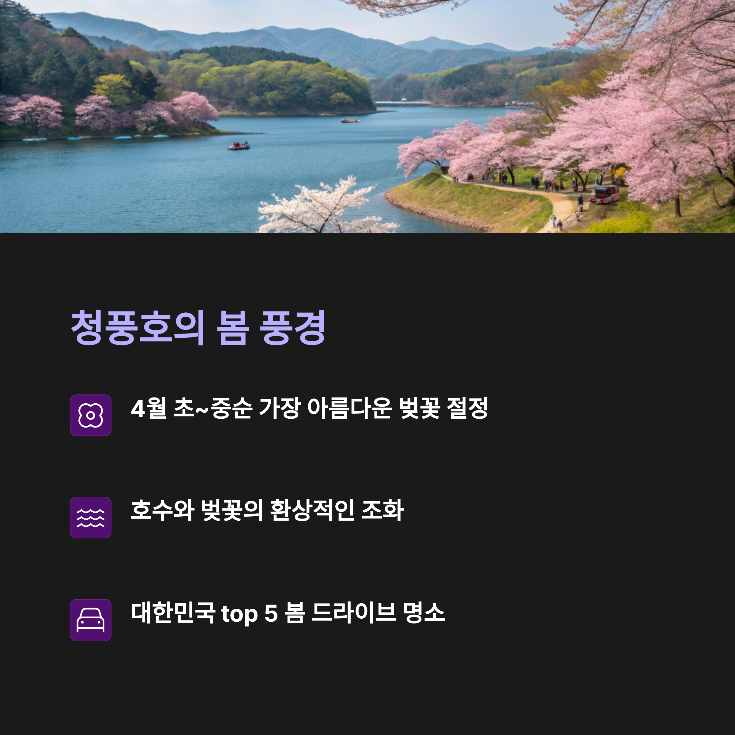 | 제천 청풍면 일대 벚꽃길 드라이브 명소 | 청풍문화재단지, 금월봉 전망대 | 평일 오전 시간 추천, 소풍 용품 준비 |
