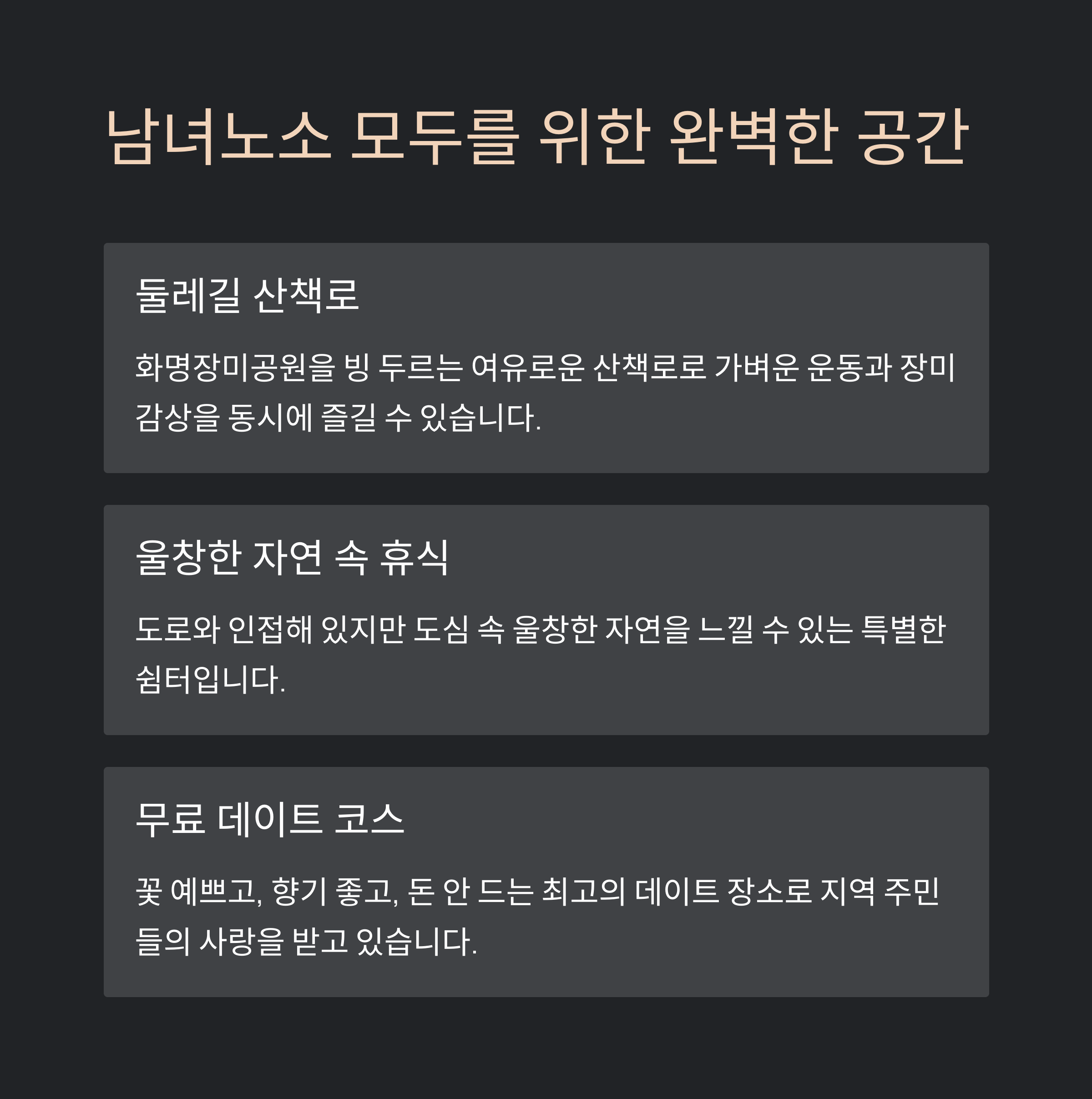 "가족, 연인, 친구 누구와 와도 즐길 거리가 가득한 공원입니다"