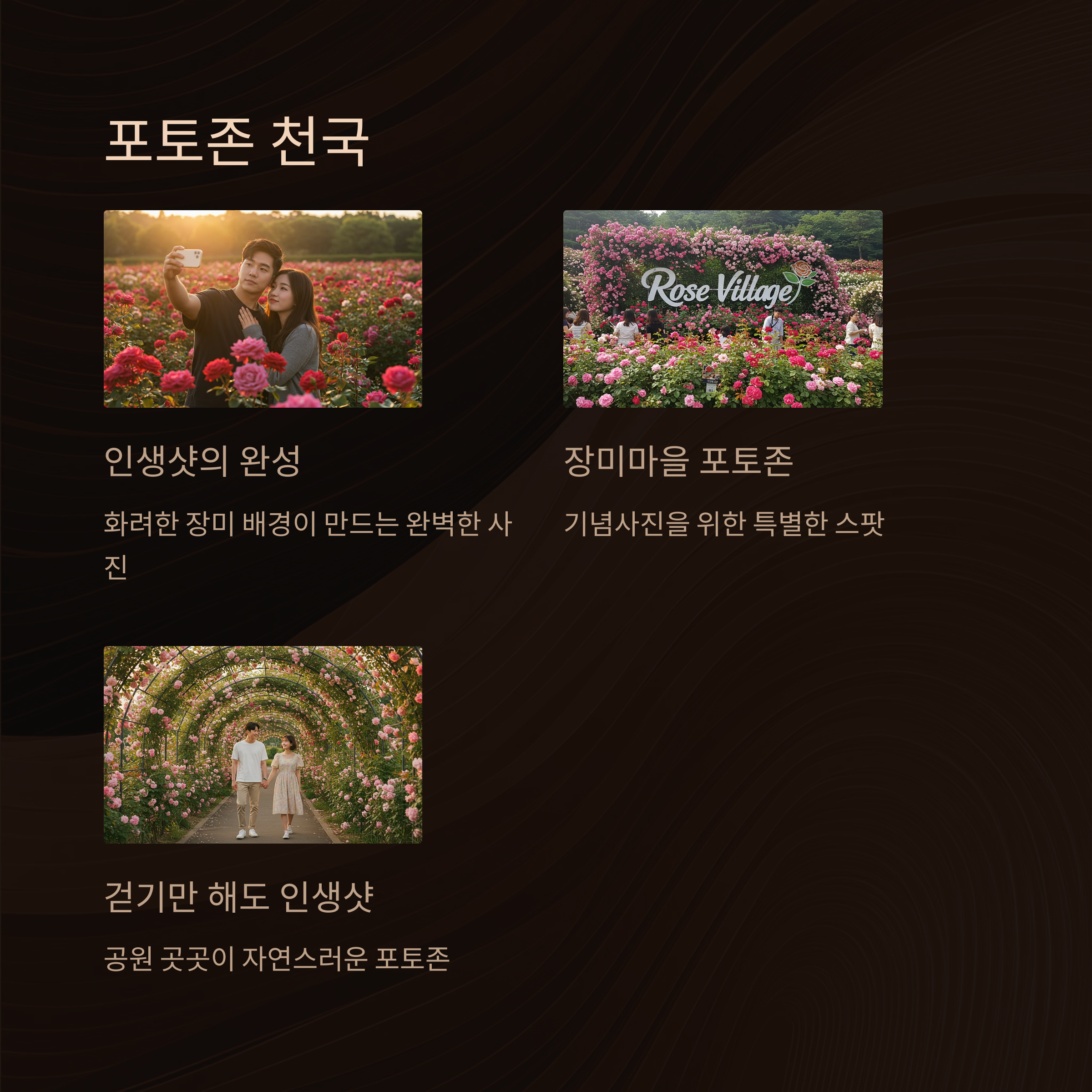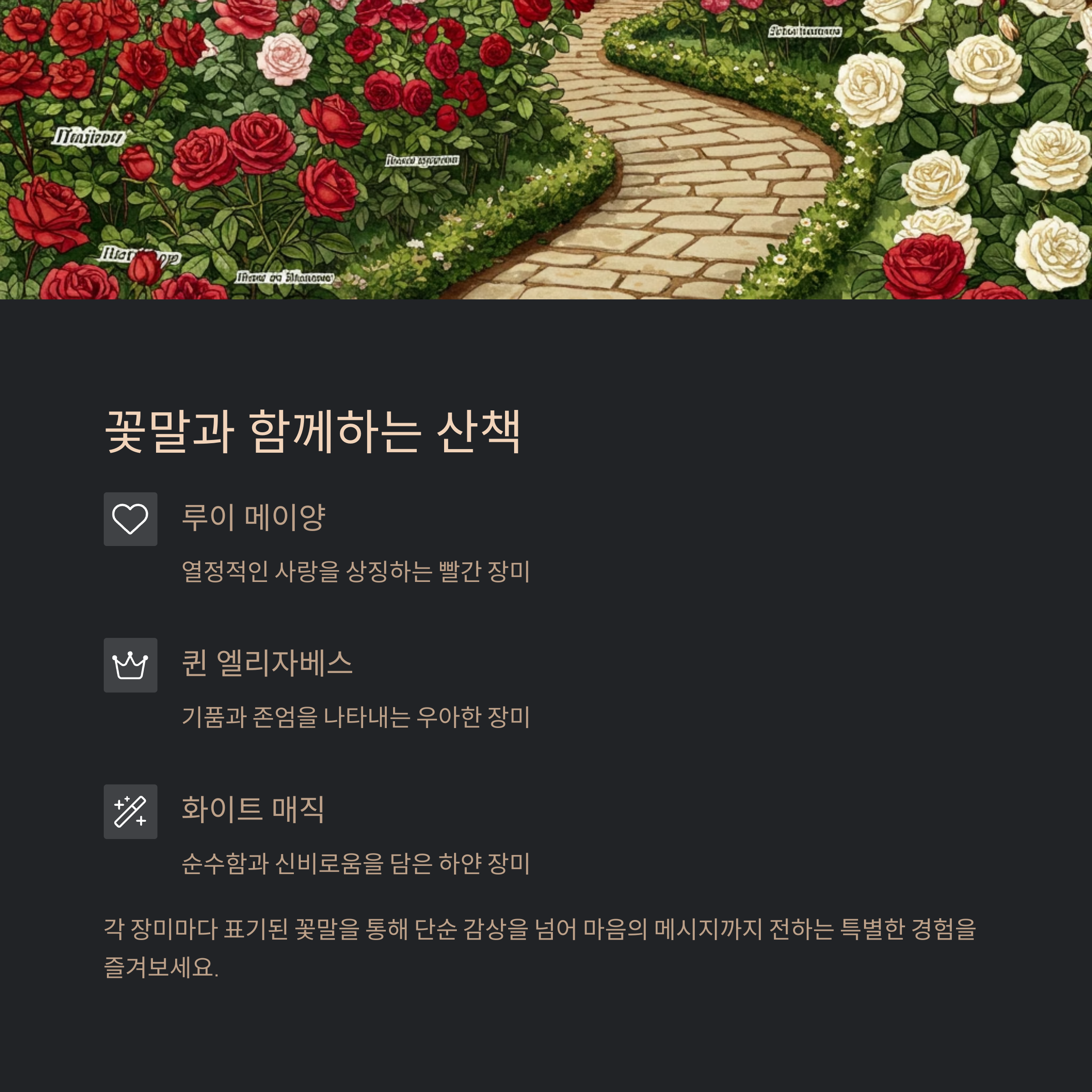 "한 걸음만 옮기면, 장미가 반겨주는 동화 속 풍경이 펼쳐집니다"