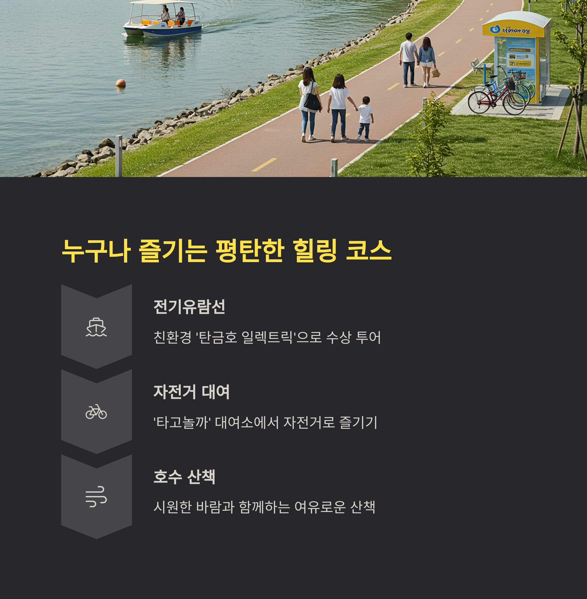 호숫가를 따라 부드럽게 이어지는 감성 산책로입니다.