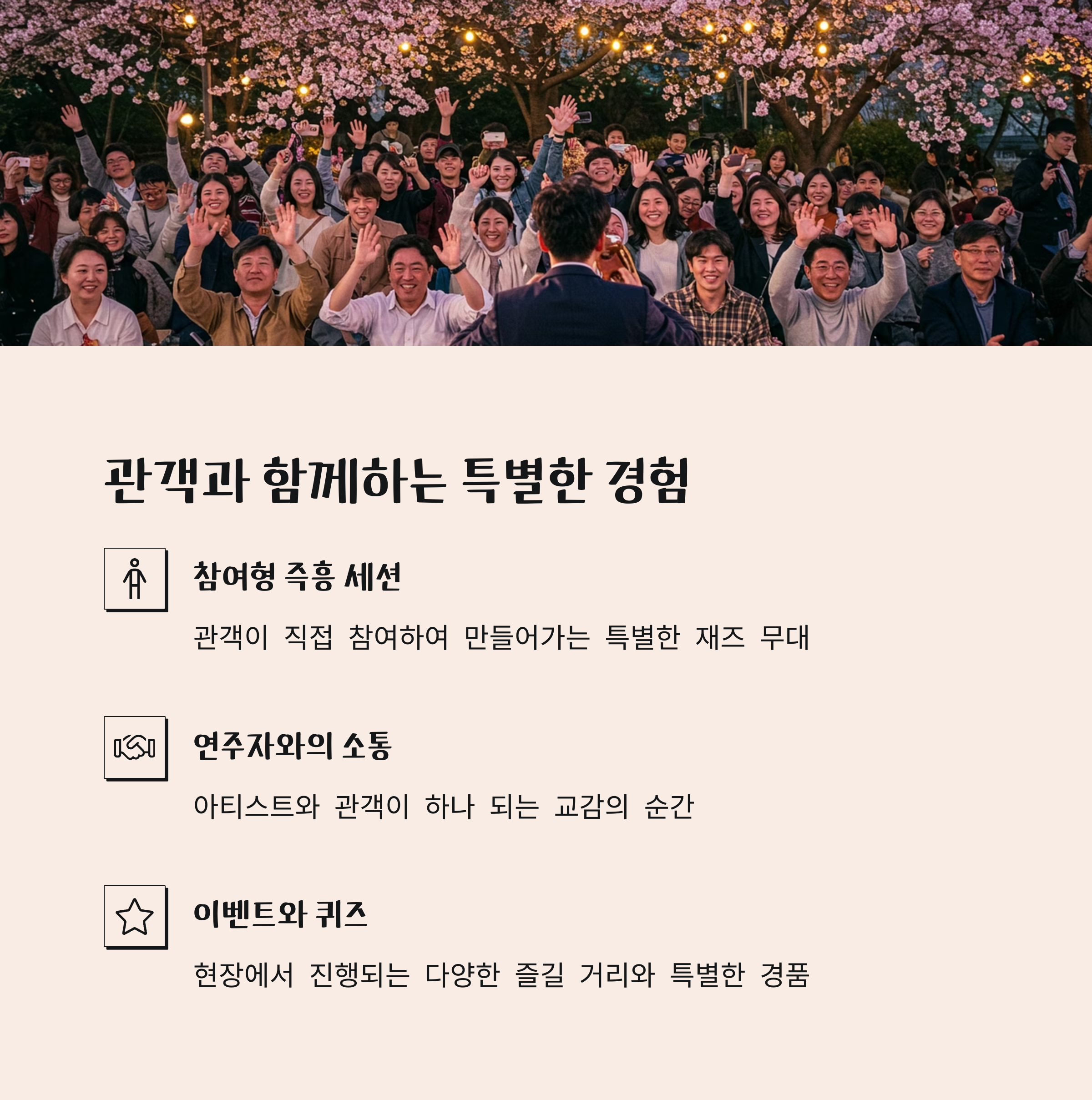 기성 공연에서는 느낄 수 없는 생동감을 선사합니다.