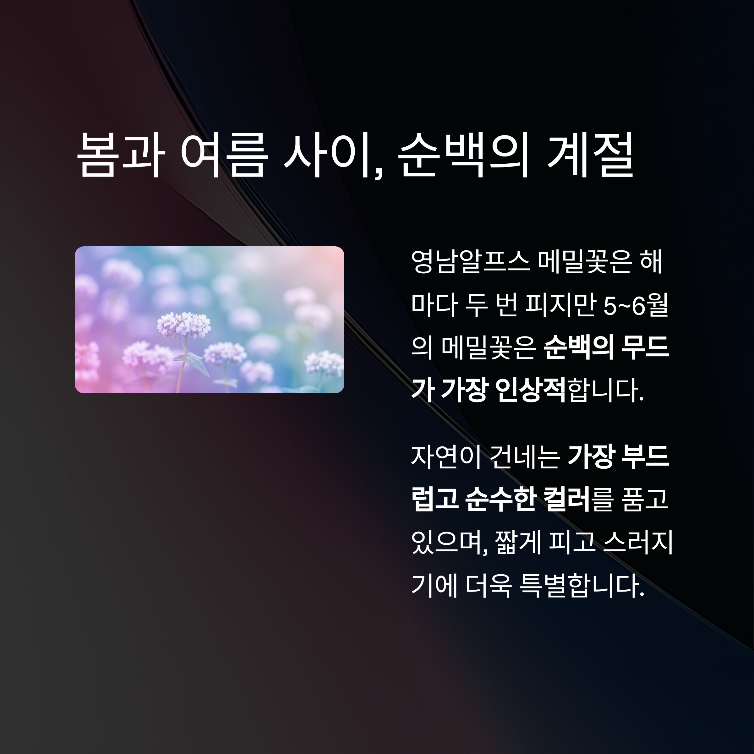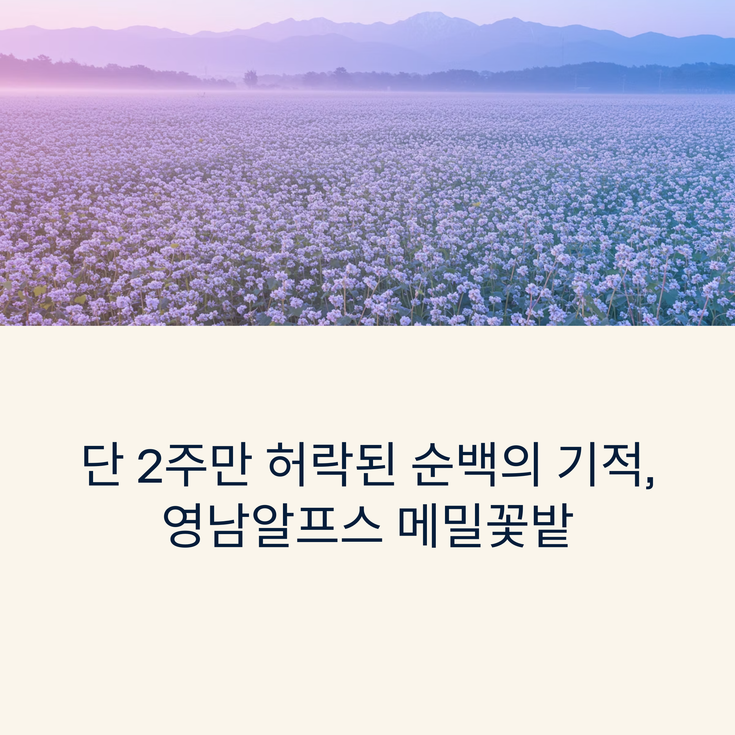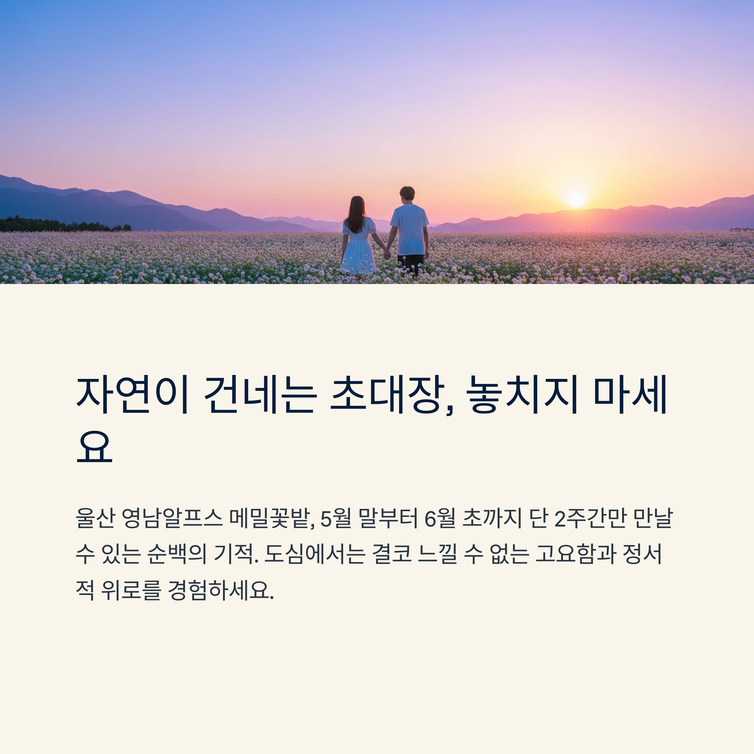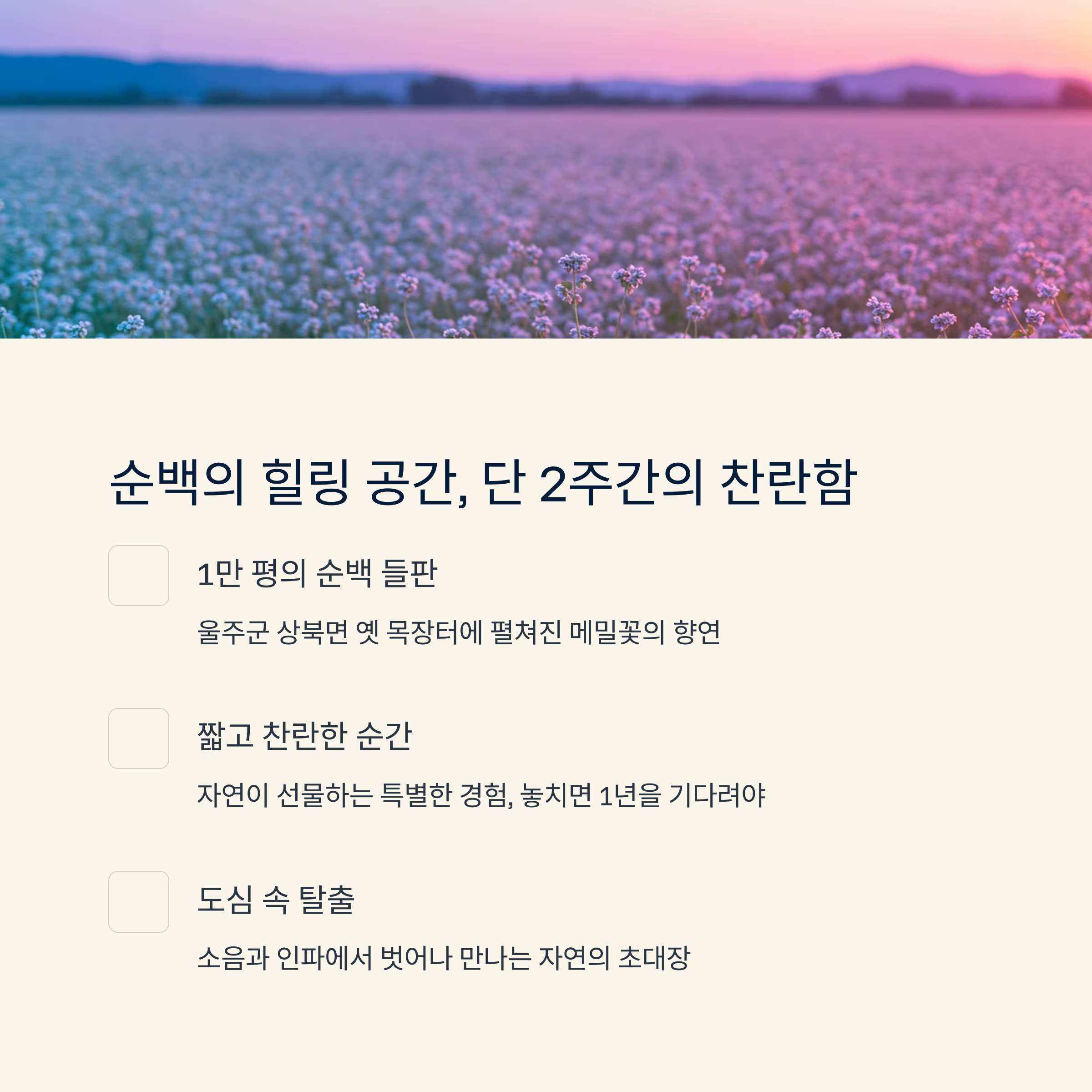 도심의 소음과 인파에서 벗어나, 지금 아니면 또 1년을 기다려야 하는 특별한 메밀꽃 절정기를 함께 만나보세요.