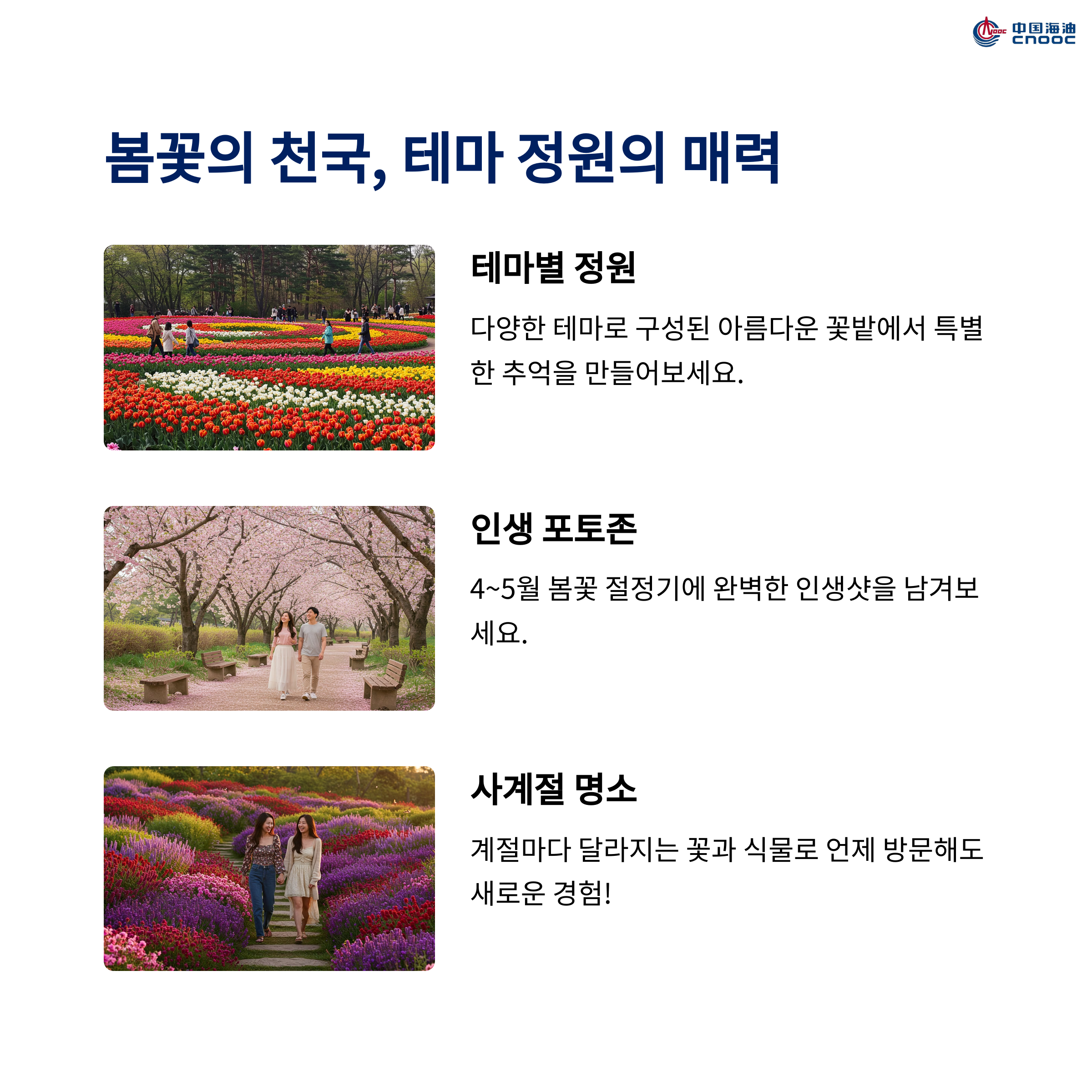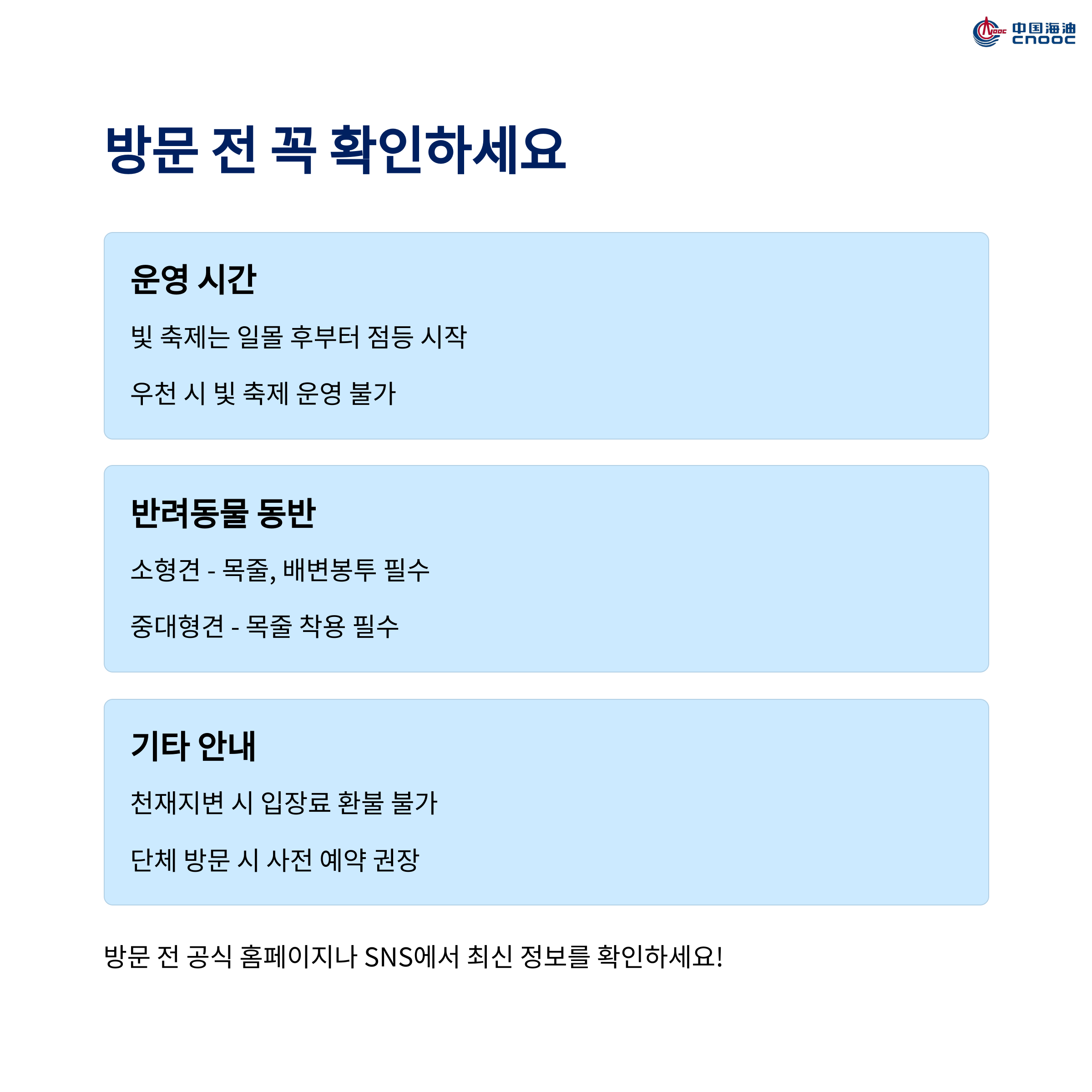 - 계절별 개화 상황과 빛 축제 운영 시간은 공식 SNS 사전 확인 필수