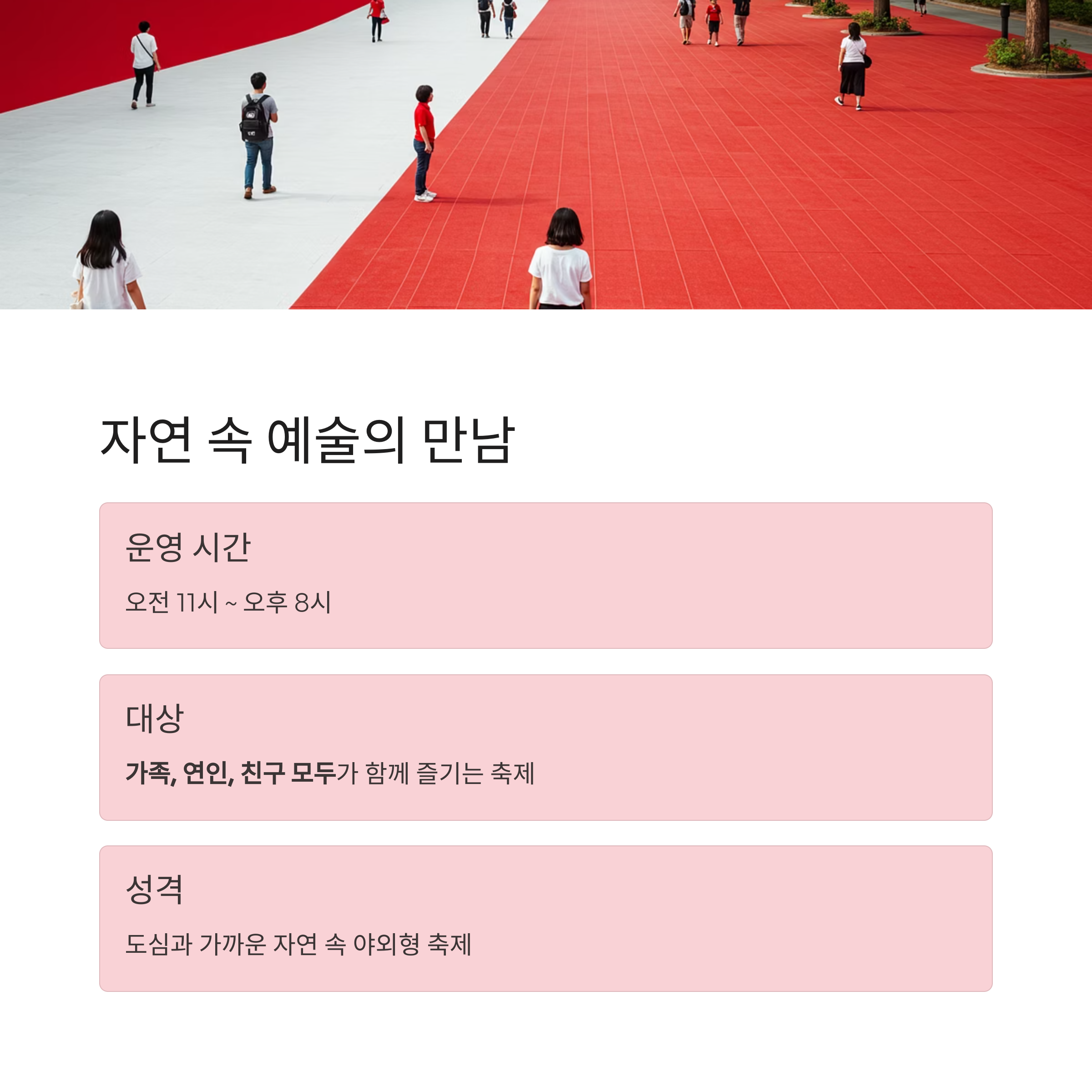 대형 설치미술, 자연 기반 체험형 작품, 감성 포토존으로 가득 찹니다.