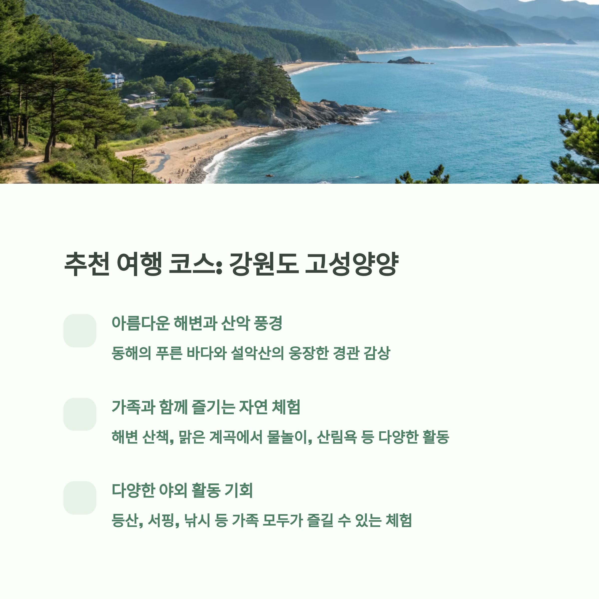 | 체크리스트 작성 및 사전 점검이 중요 | 바다·산·먹거리 조화로운 코스 선정 | 아이 안전 고려한 장소 선정 |