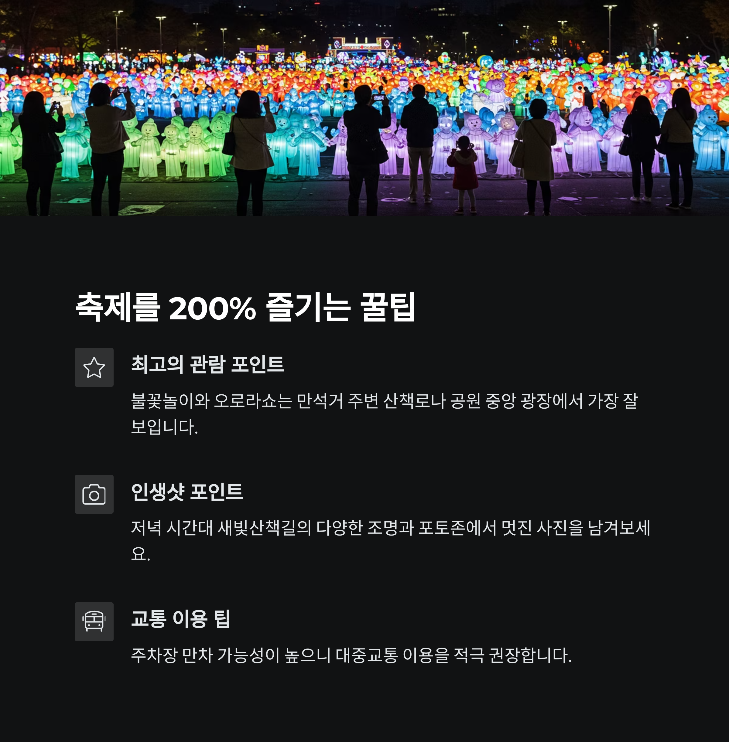 다양한 조명과 포토존을 활용해 인생샷을 남겨보세요 - 대중교통 이용을 권장합니다