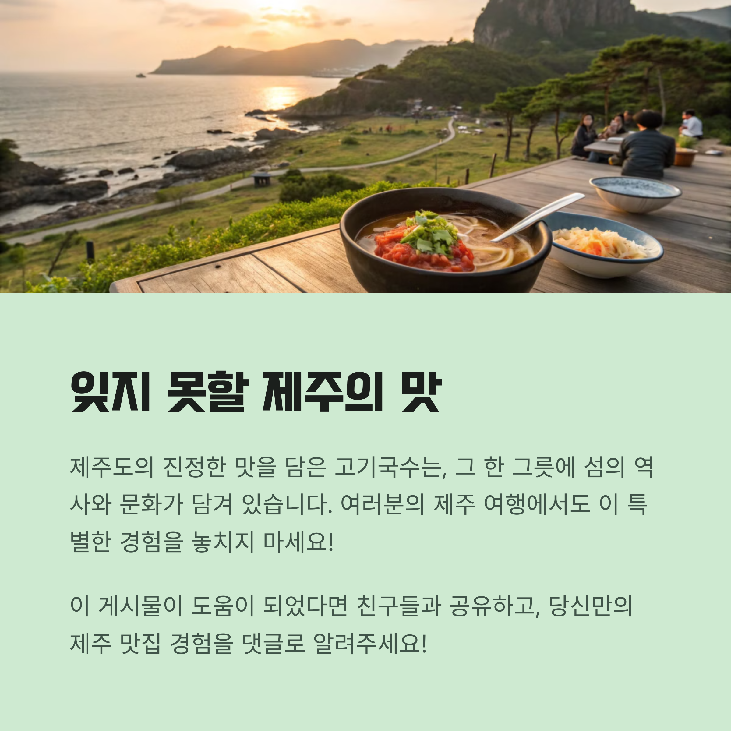 제주도에서의 한 끼는 단순한 식사를 넘어 여행의 감동을 더하는 소중한 시간입니다. 특히 고기국수처럼 현지의 정서가 담긴 음식은 더욱 특별한 의미로 다가옵니다. 오늘 소개한 고기국수 맛집은 수많은 경험 속에서 진짜 가치 있는 한 끼로 선택된 곳이니 여러분도 꼭 한 번 들러보시기를 바랍니다. 따뜻한 국물 한 숟가락이 제주에서의 하루를 더욱 풍요롭게 만들어줄 거예요
