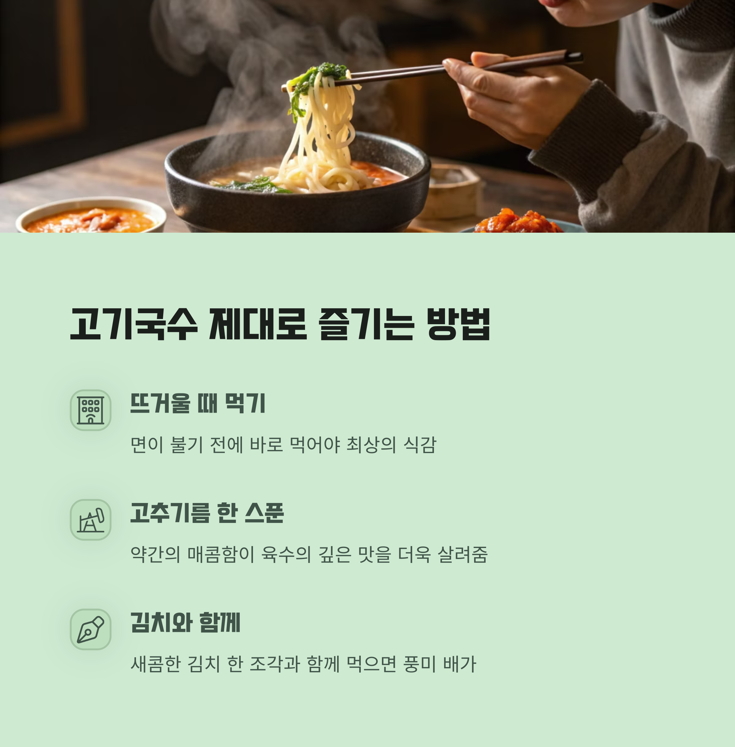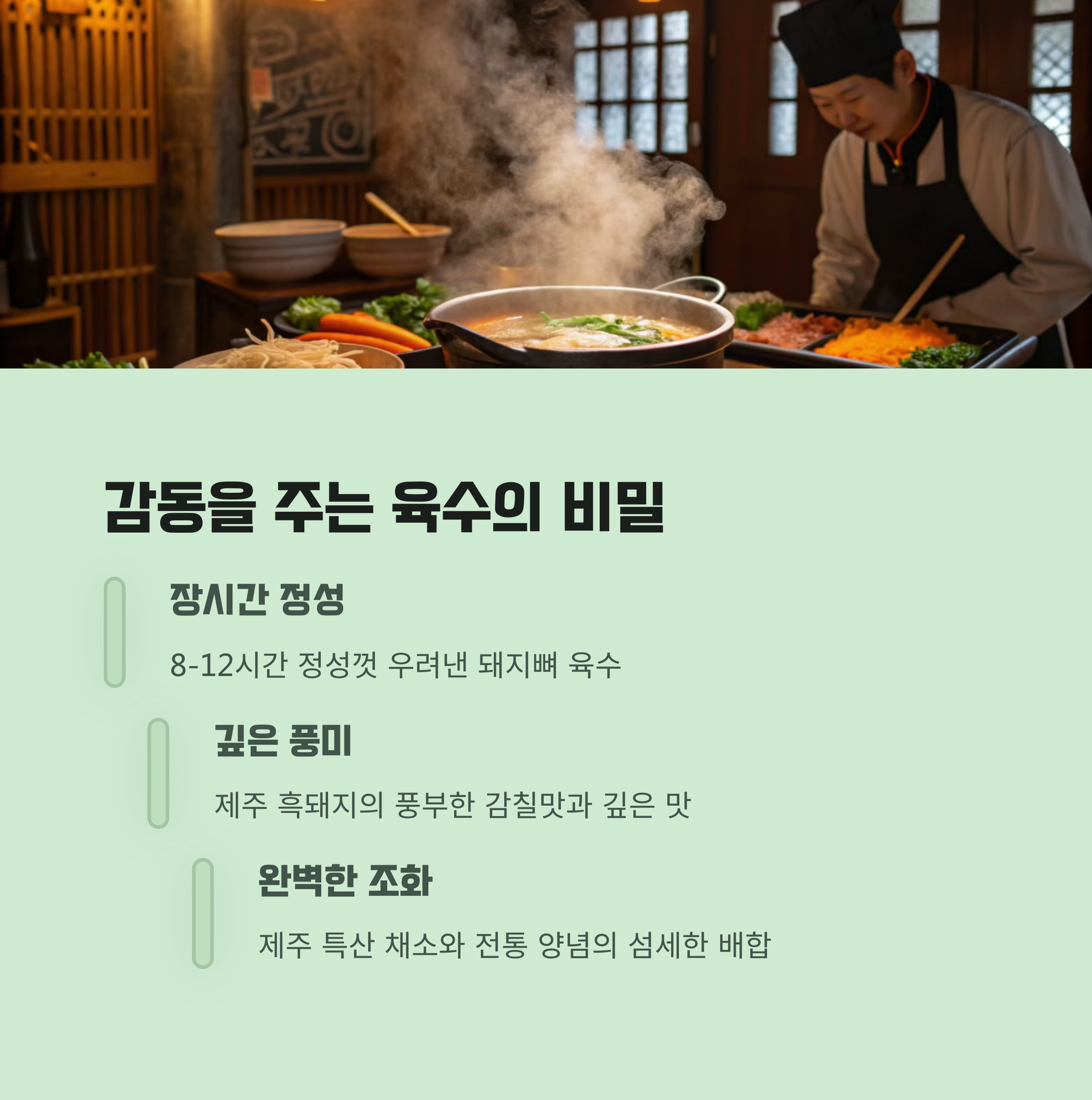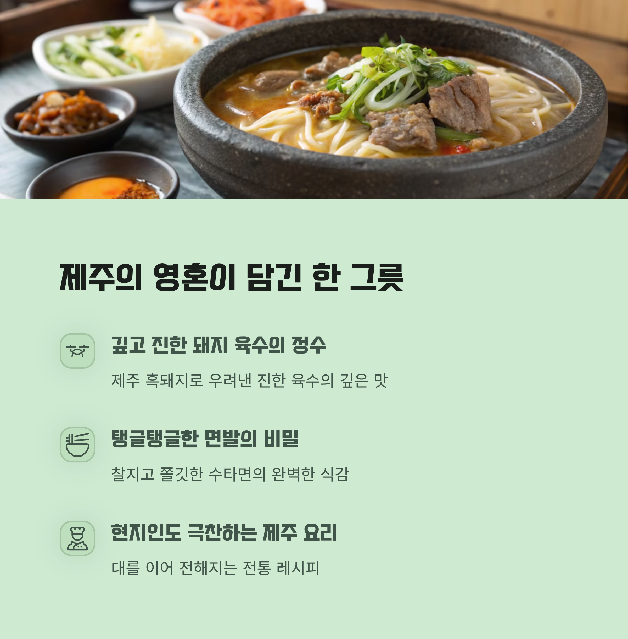 | 제주 고기국수 | 육향 가득한 진한 국물이 핵심입니다 |