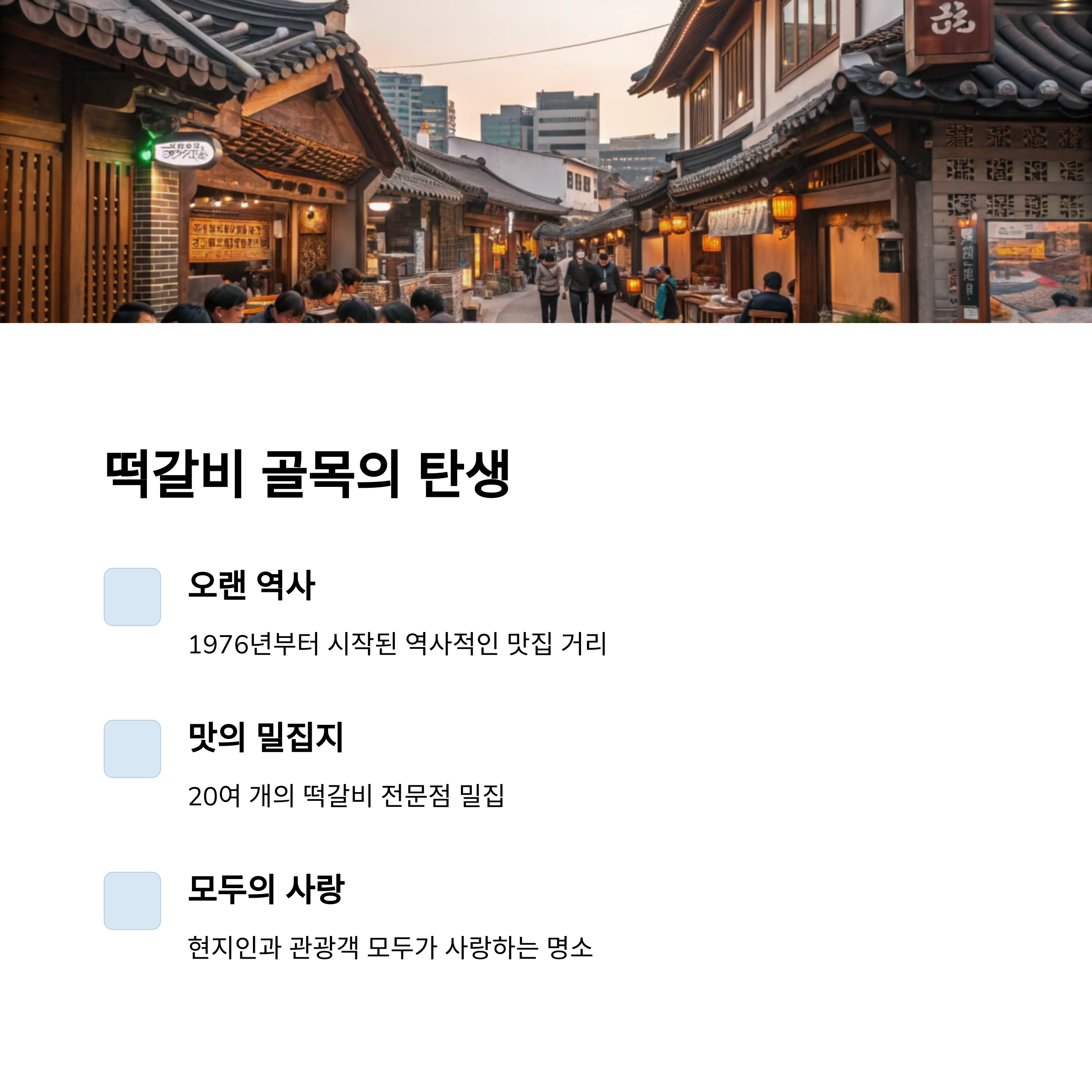 광주에 도착하자마자 발걸음이 향한 곳은 바로 유명한 떡갈비 골목이었습니다. 평일 낮시간임에도 불구하고 이미 줄을 선 사람들이 많았고, 그만큼 이 골목에 대한 기대감이 얼마나 큰지 실감할 수 있었습니다. 입구부터 풍겨오는 고소한 향은 그 자체로 훌륭한 안내서였습니다. 골목 사이사이 자리한 떡갈비 전문점들은 각자 고유의 전통과 맛을 자랑하고 있었고, 그 중에서도 특히 숯불로 구운 떡갈비집은 진한 불향이 코끝을 자극하며 자연스럽게 발길을 이끌었습니다.