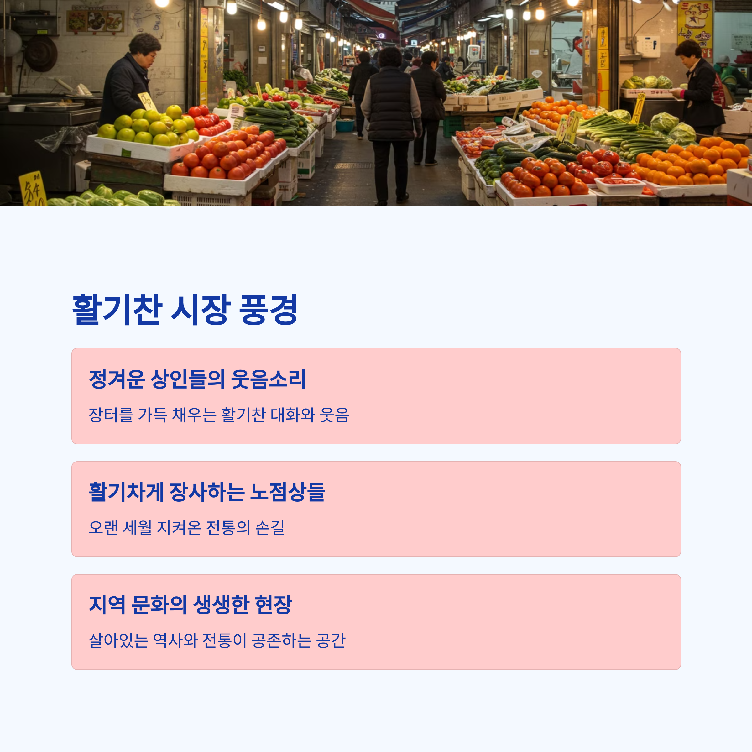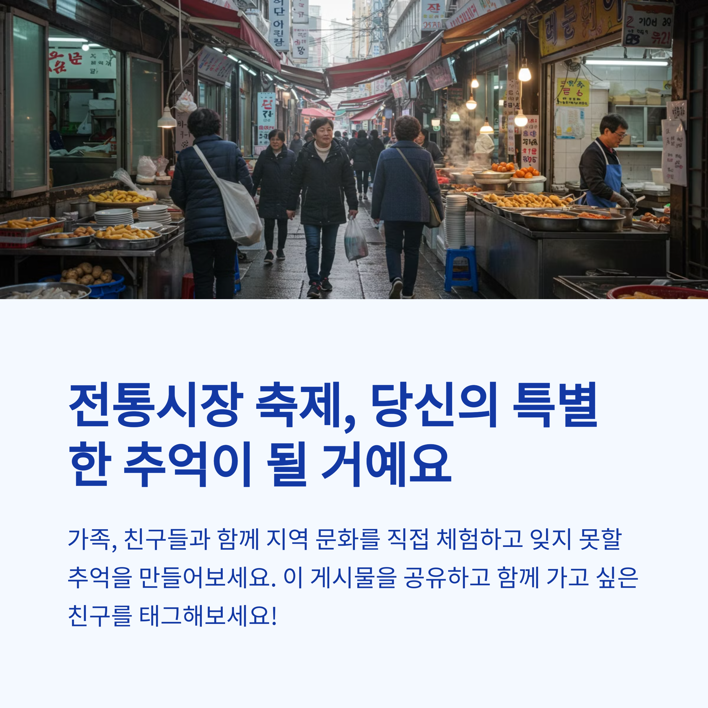 | 전통시장 축제 | 지역별 고유 먹거리와 공연이 함께하는 특별한 장터 |