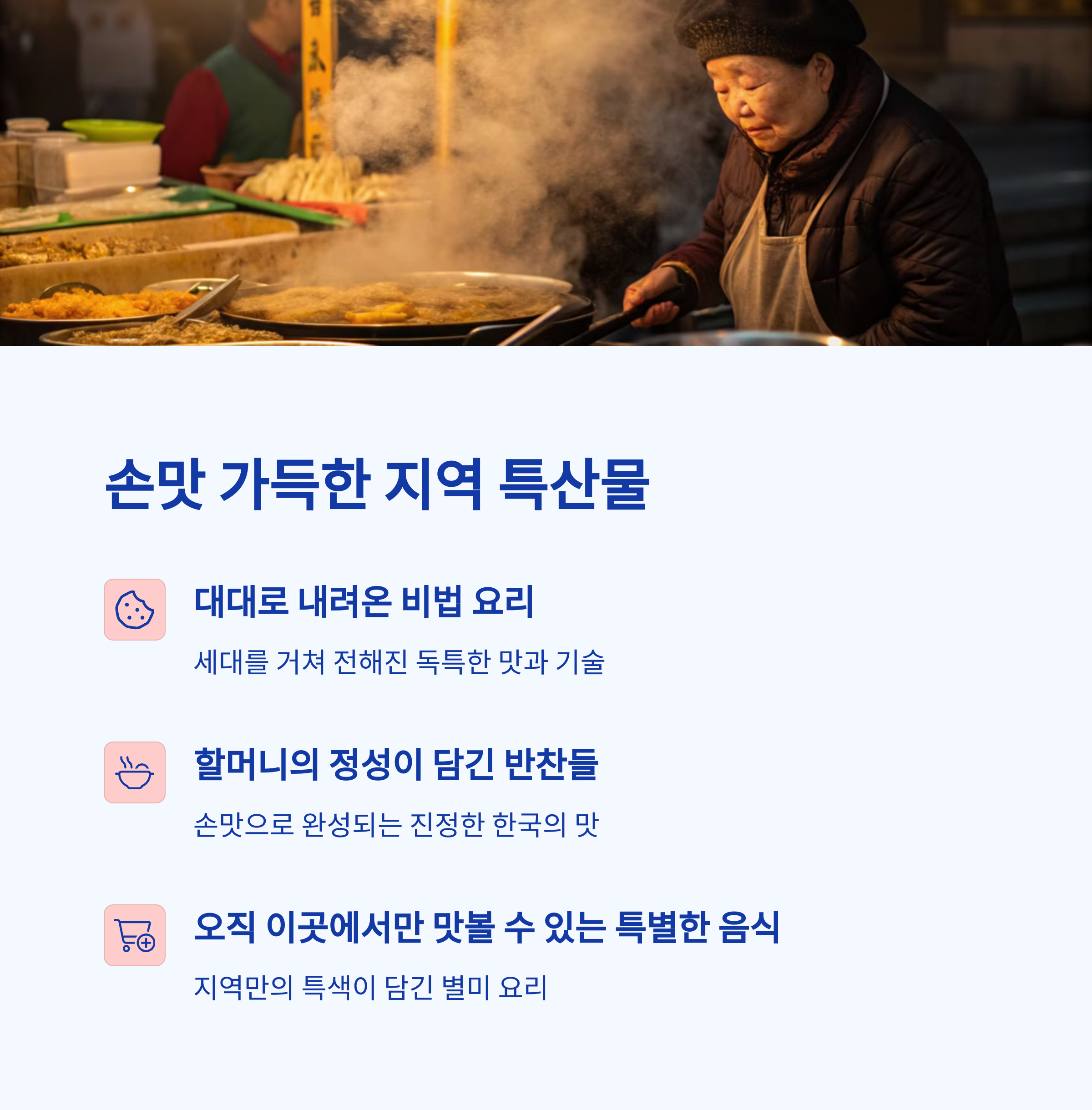 | 지역 축제 음식 | 손맛 먹거리 | 전통시장 체험 |