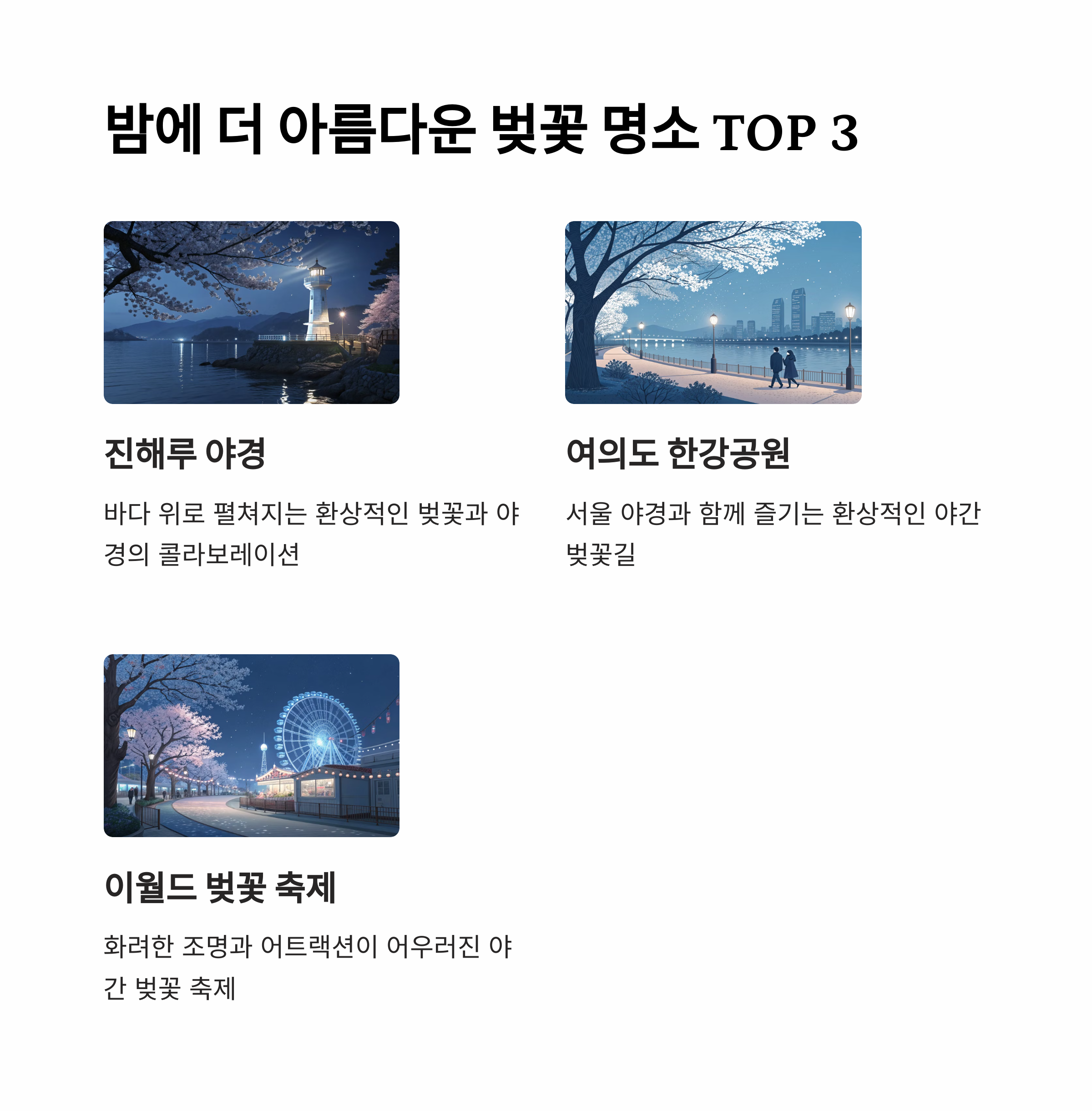 | 전국 최대 벚꽃 축제로 매년 수백만 명이 방문 | 다양한 푸드트럭과 야간 퍼포먼스가 인기 | 여의도, 경주, 석촌호수 등 촬영 명소 안내 |