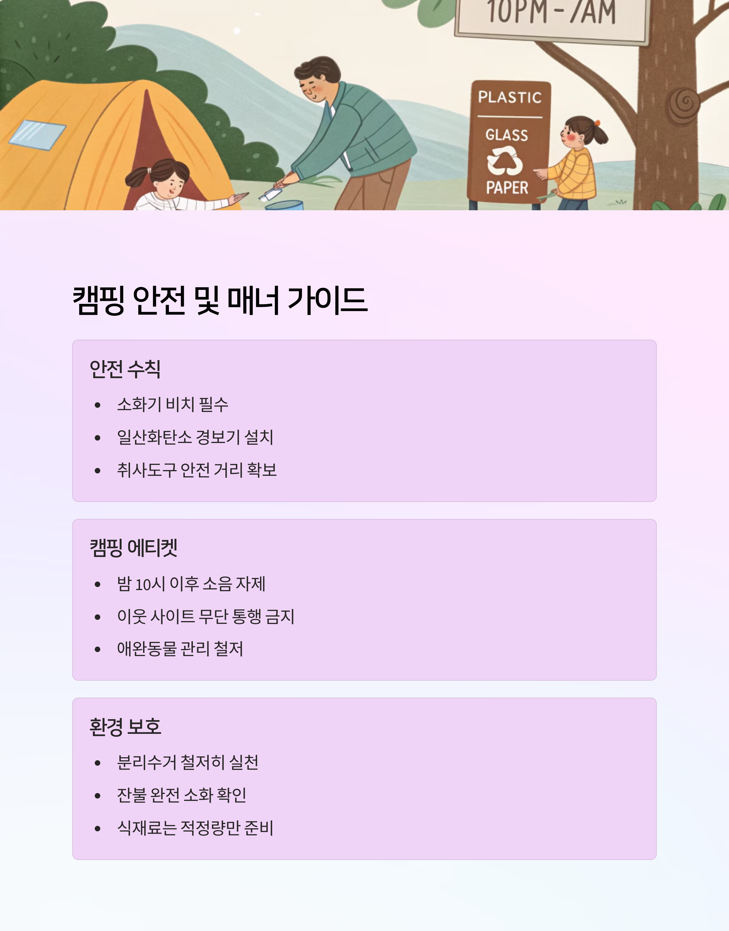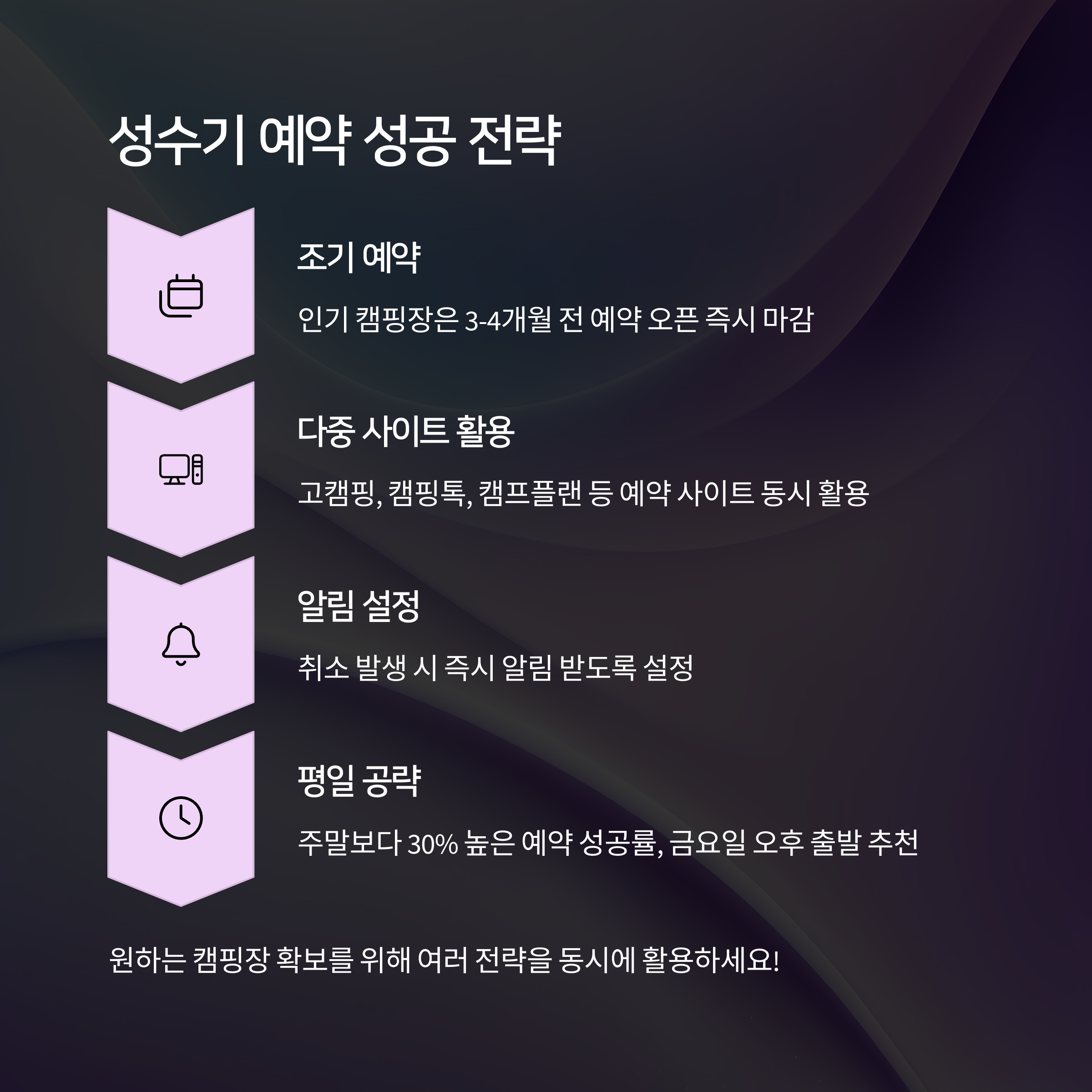 | 시설, 접근성, 자연환경, 리뷰 기반 분석 | 예약 오픈 시간 체크 및 빠른 입력 전략 | 강원, 경기, 경남, 제주 등 인기 캠핑지 포함 |