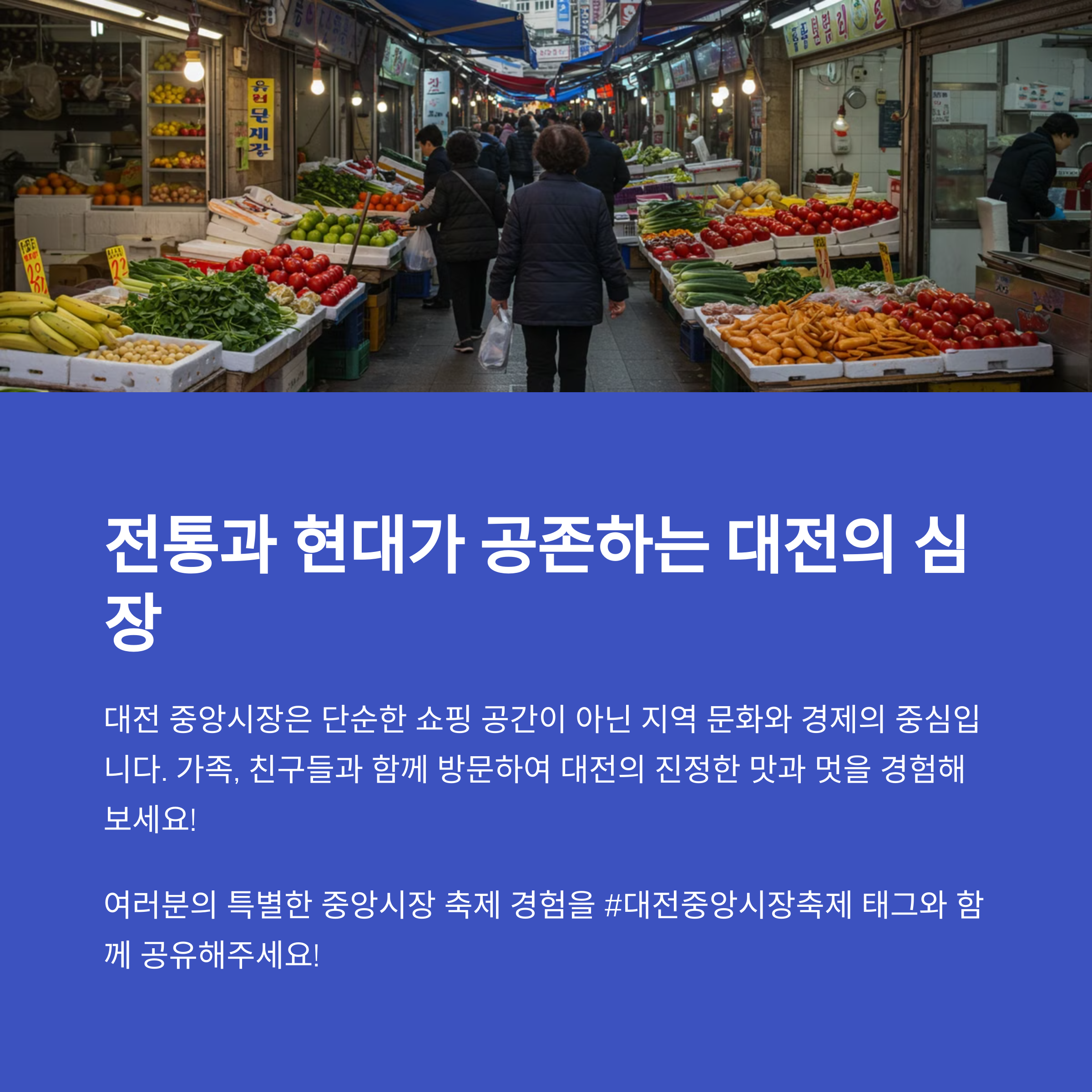 | 대전 도심 속 전통시장으로 다양한 행사가 열려요. | 지역 주민과 관광객 모두가 함께하는 즐거운 시간 | 아이들과 어른 모두 즐길 수 있는 다채로운 부스 |