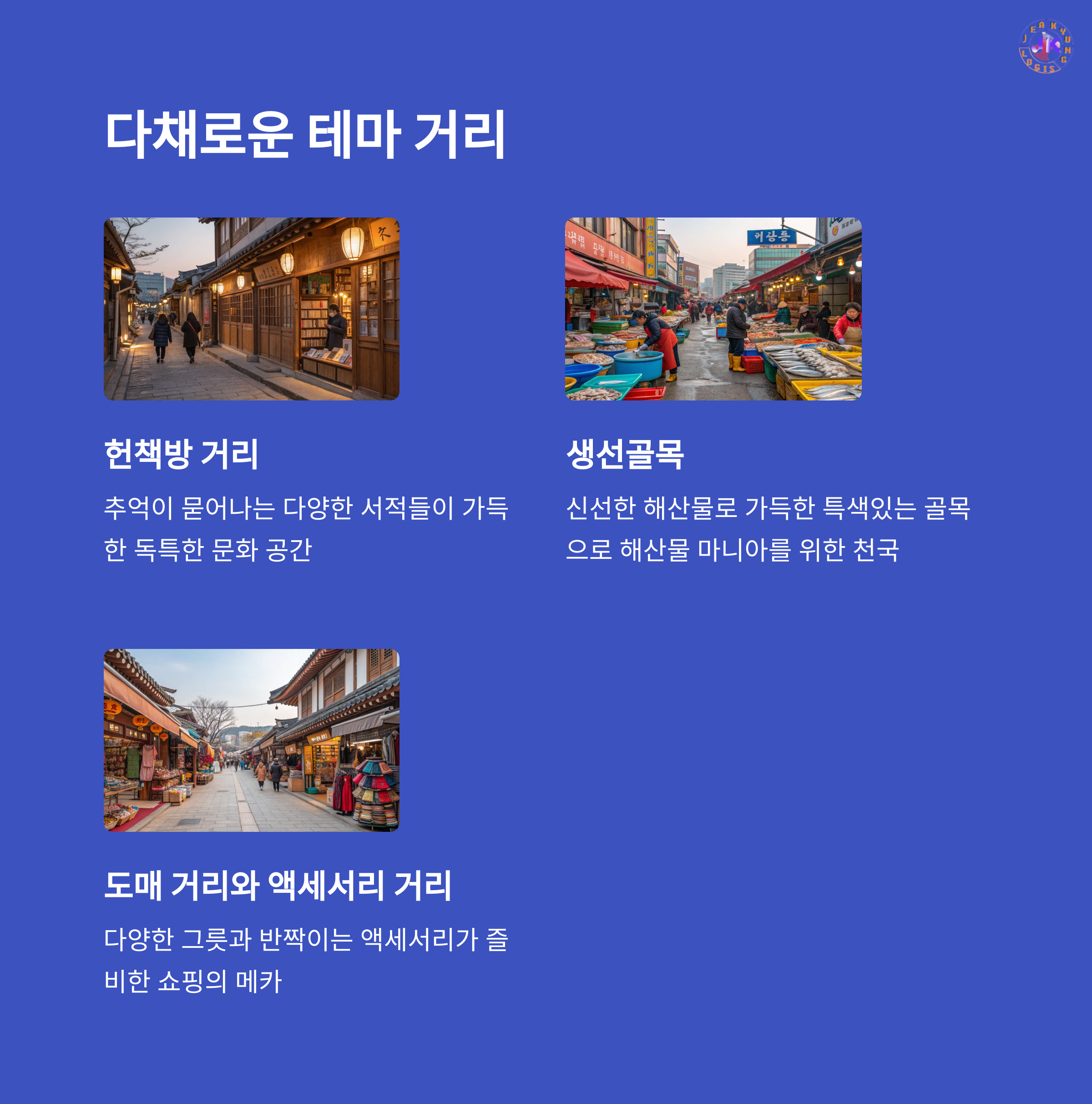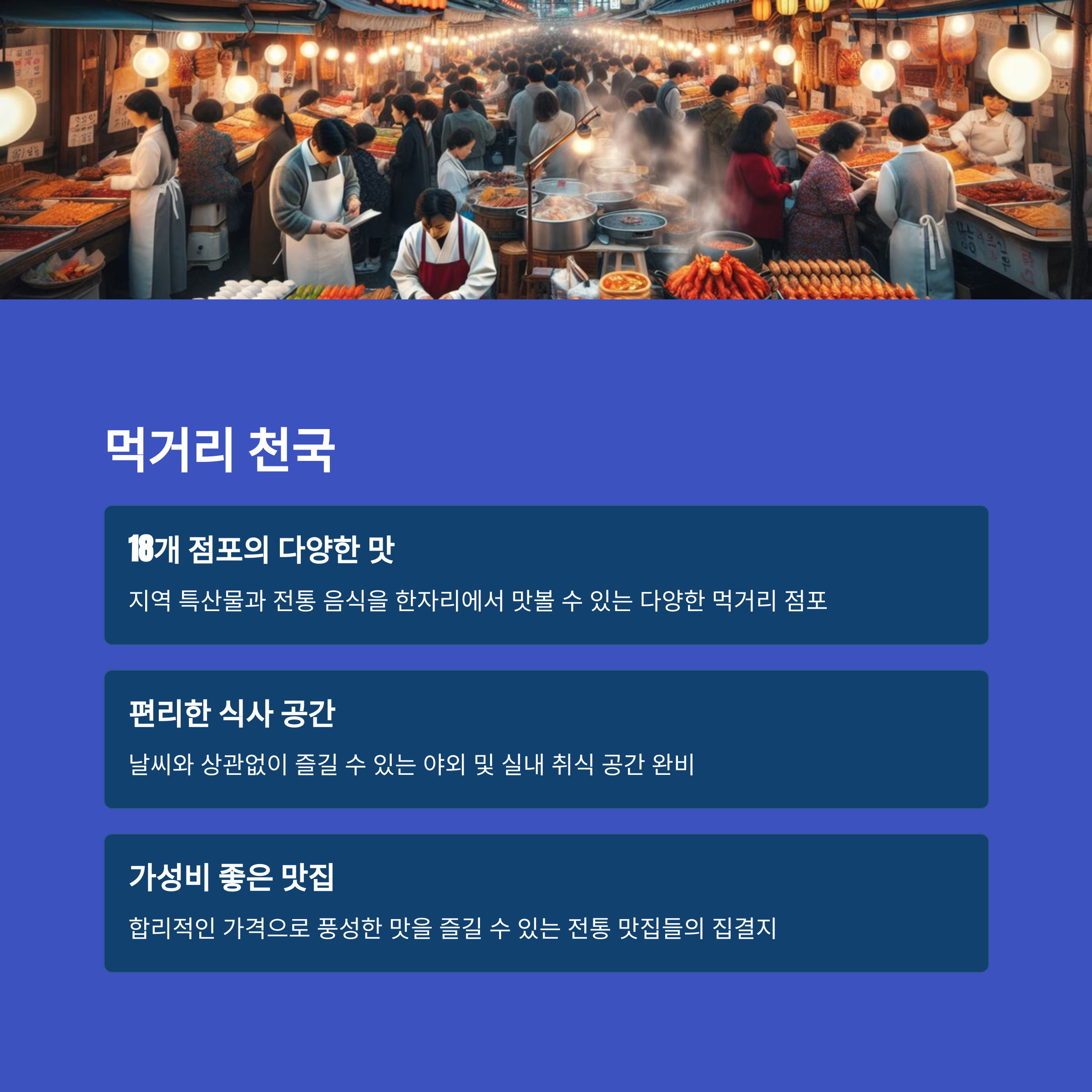 | 음식, 공연, 전통 공예 등 전통과 현대가 공존해요. | 계절별로 열리는 지역 행사 중 대표적인 축제 | 만들기, 게임, 먹거리 등 다양하게 참여할 수 있어요. |