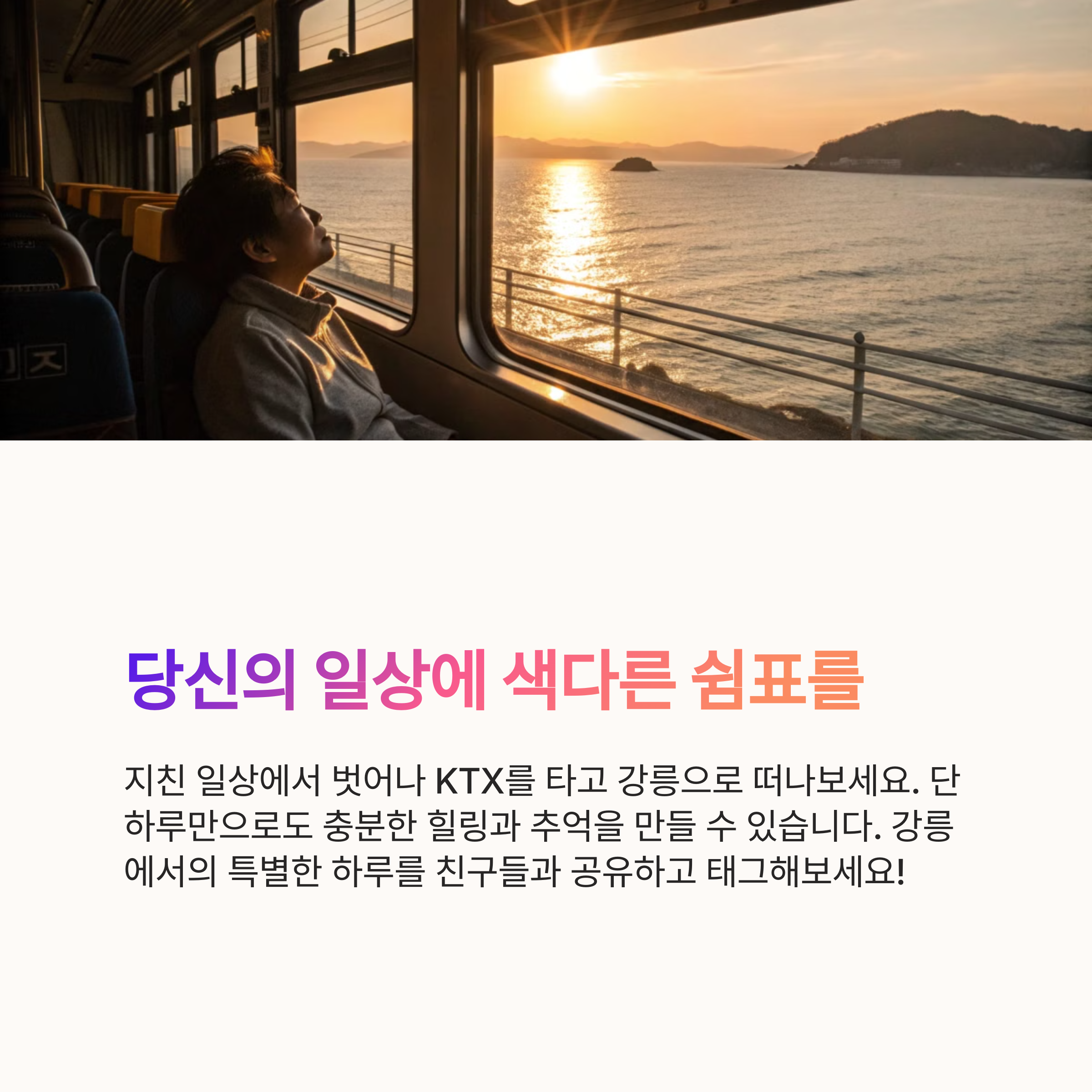 강릉선 KTX를 활용한 당일치기 여행은 짧지만 강렬한 여운을 남깁니다. 혼자만의 여유를 즐기거나 사랑하는 사람과의 추억을 만들기에 더없이 좋은 선택입니다. 도시의 소음에서 벗어나 자연을 마주하며, 따뜻한 커피 한 잔으로 여유를 느껴보세요. 기차의 진동과 함께 떠나는 이 하루는, 분명 특별한 기억으로 남을 것입니다. 앞으로의 여행 일정에 강릉선을 꼭 한 번 포함해보시길 추천드립니다.