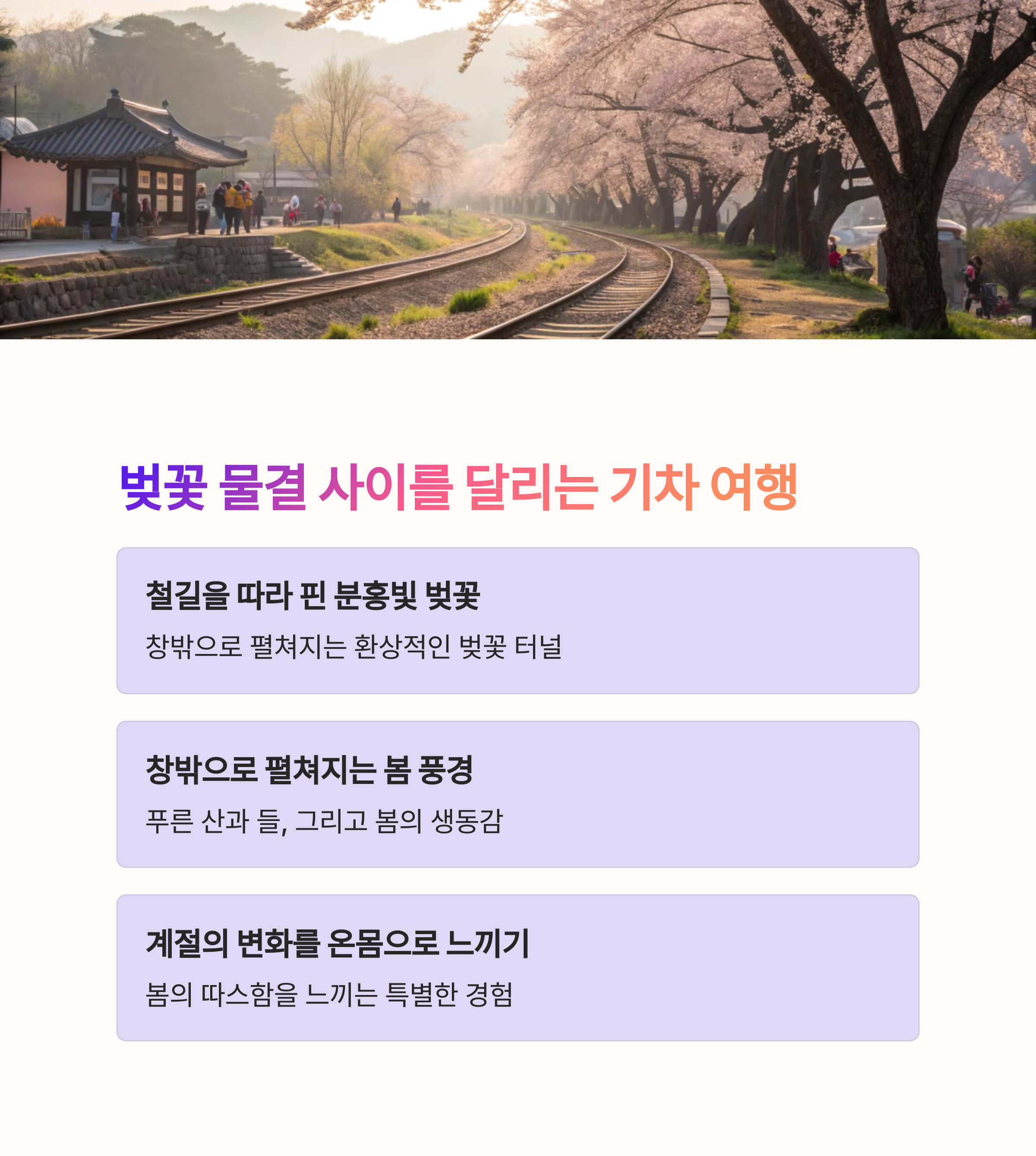 | 열차 안에서도 경치를 즐길 수 있음 | 주말여행 또는 하루 휴가에 적합 | SNS 감성 인증샷 명소 다양 |