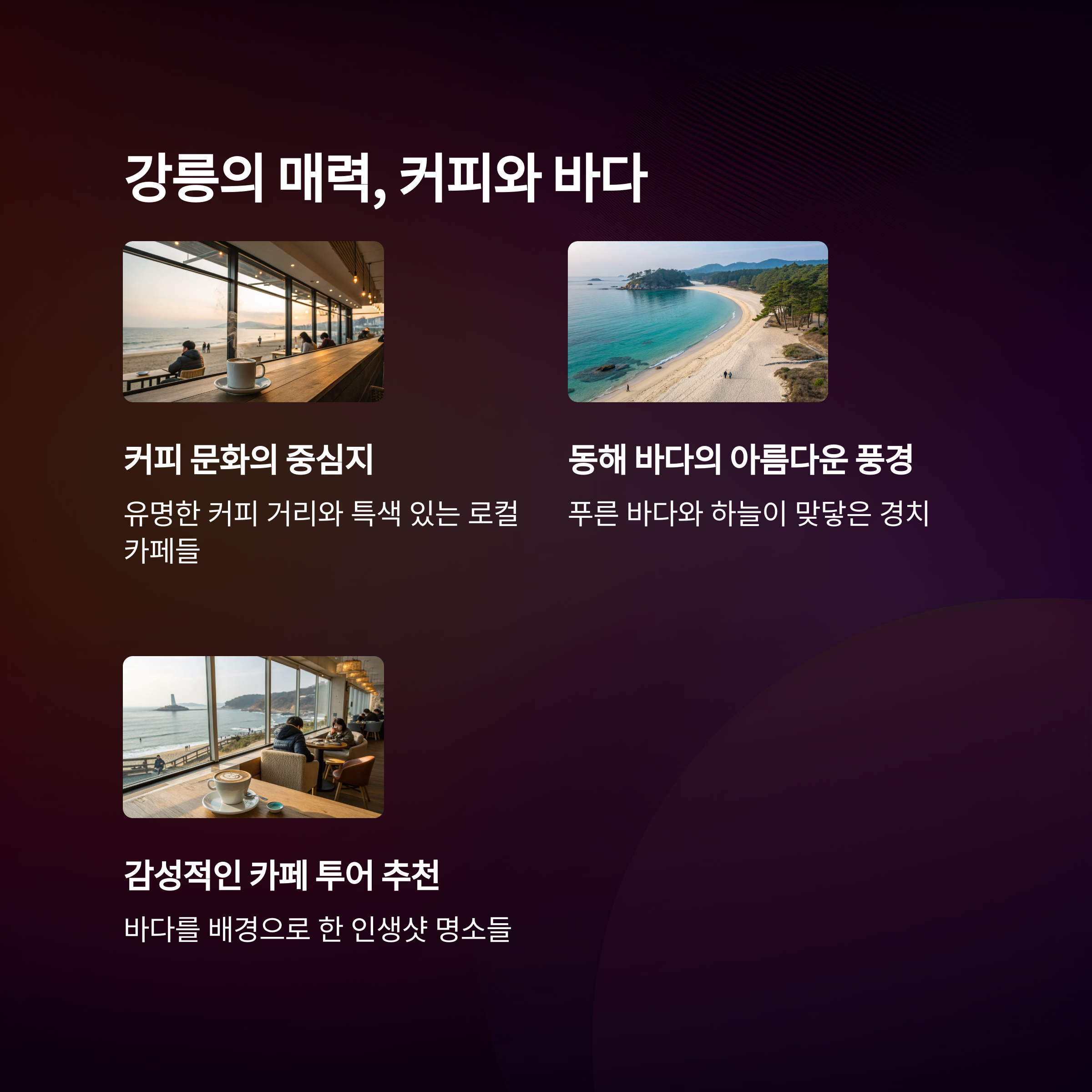 | 서울~강릉 1시간 50분, 빠른 접근성 | 아침 출발, 저녁 복귀가 가능한 효율적 일정 | 순두부, 커피거리, 중앙시장 먹거리 |