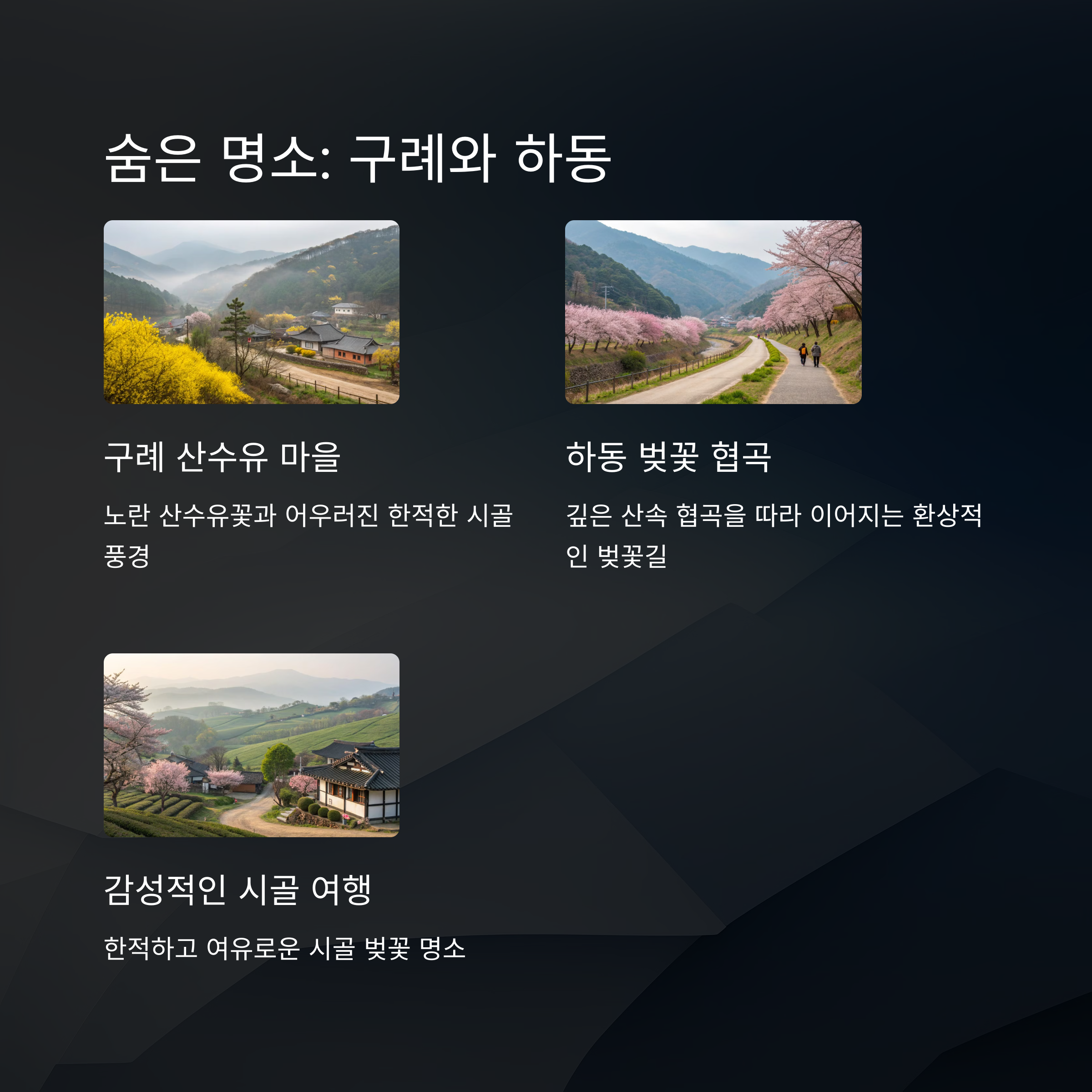 | 여행 추천 지역 | 진해, 경주, 서울, 구례, 하동 등 전국 주요 명소 |