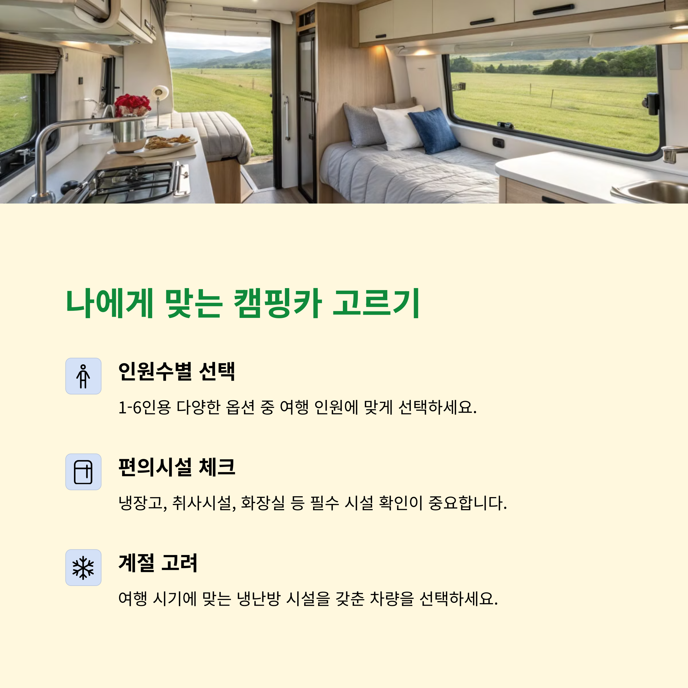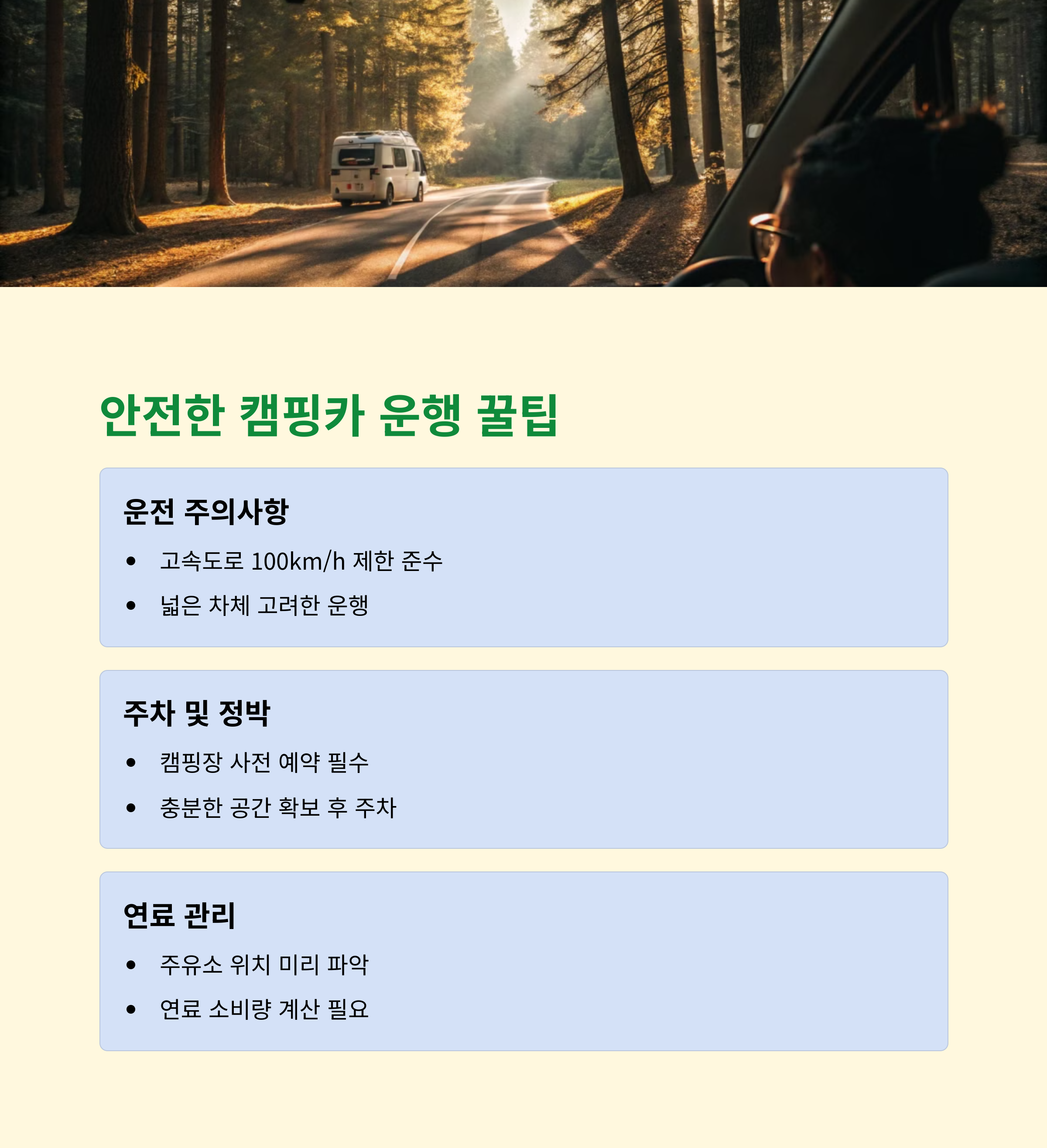 | 비용, 보험 포함 여부, 대여 조건 등을 체크 | 자연 경관과 체험 요소가 어우러진 코스 | 전기, 물, 캠핑카 사이트 사전 준비 필수 |