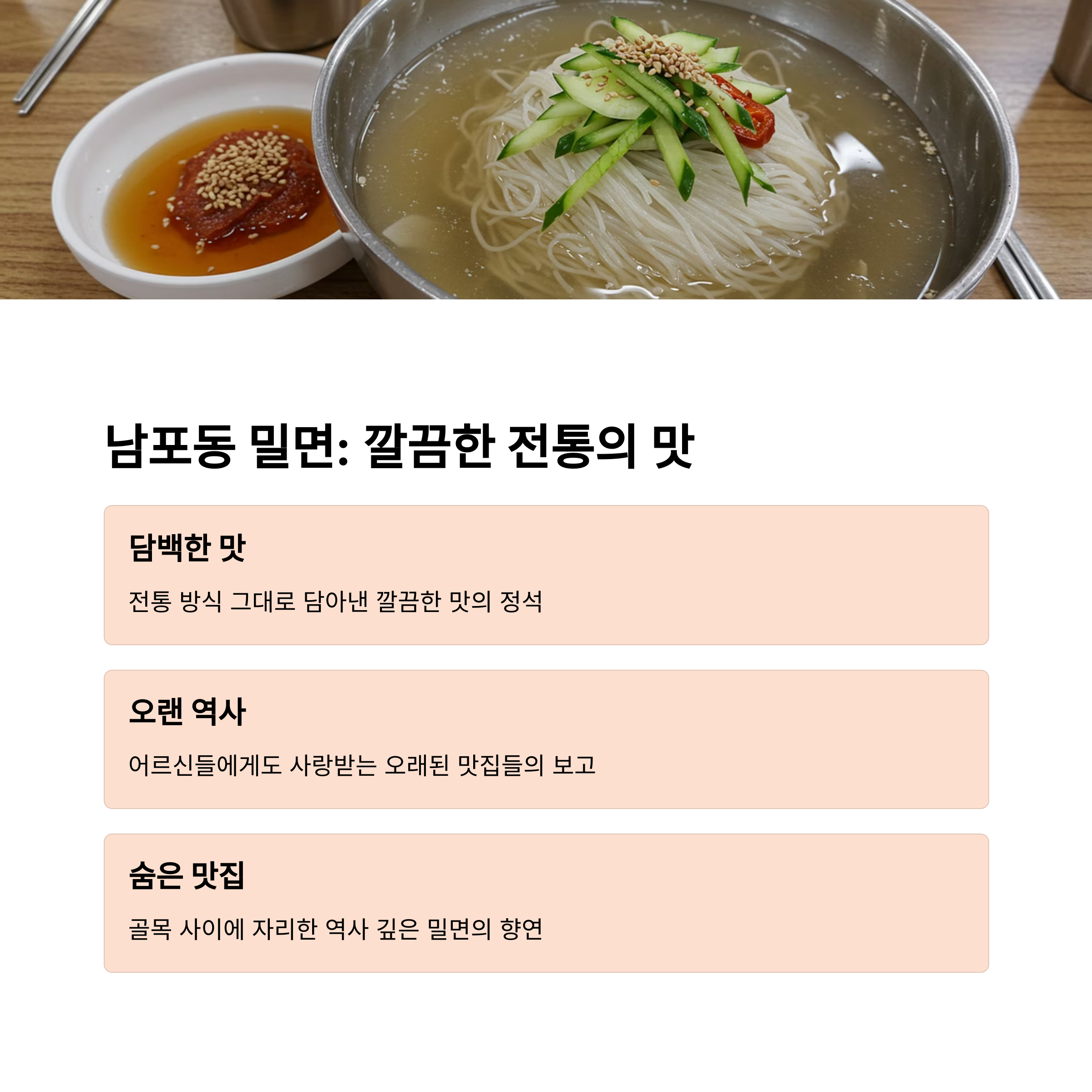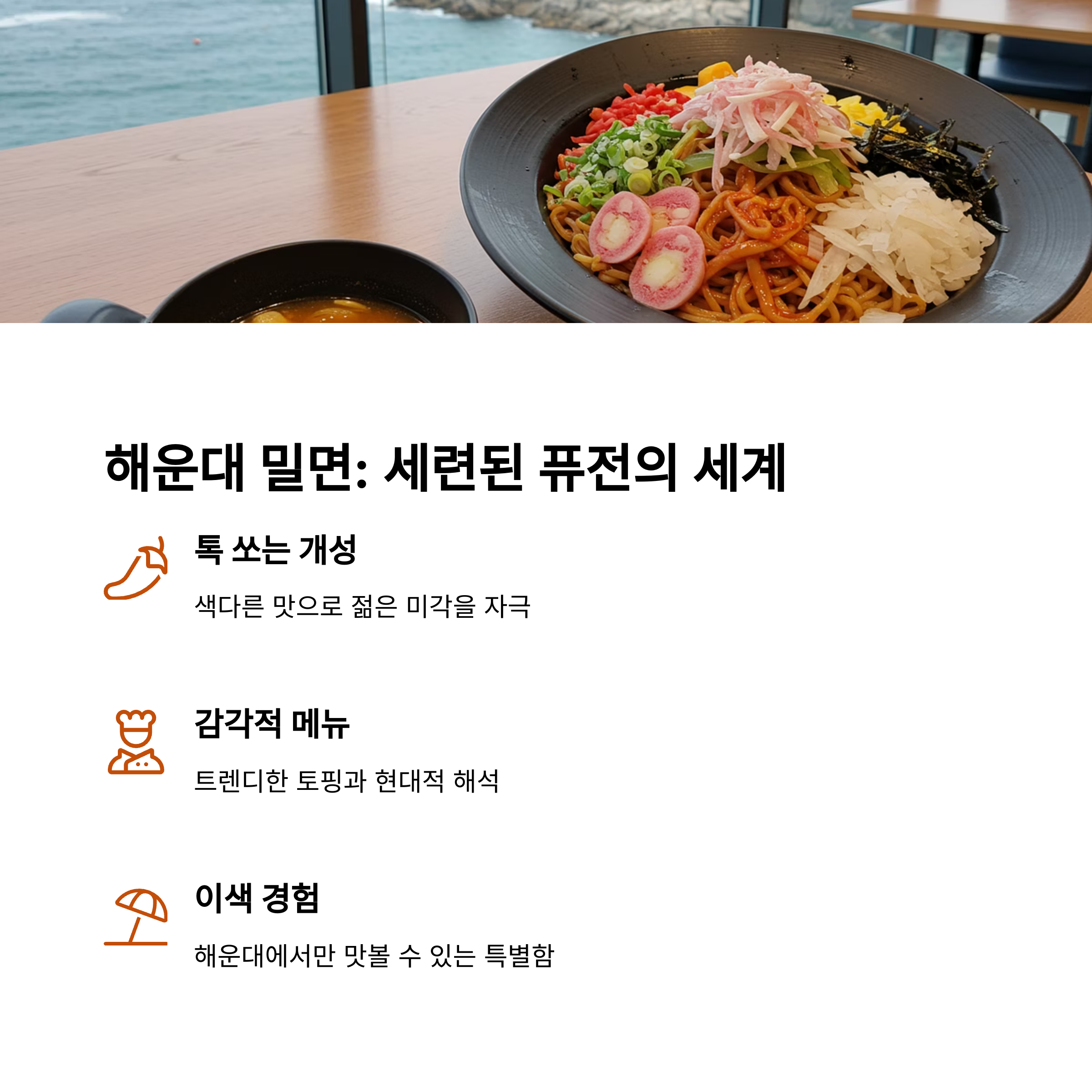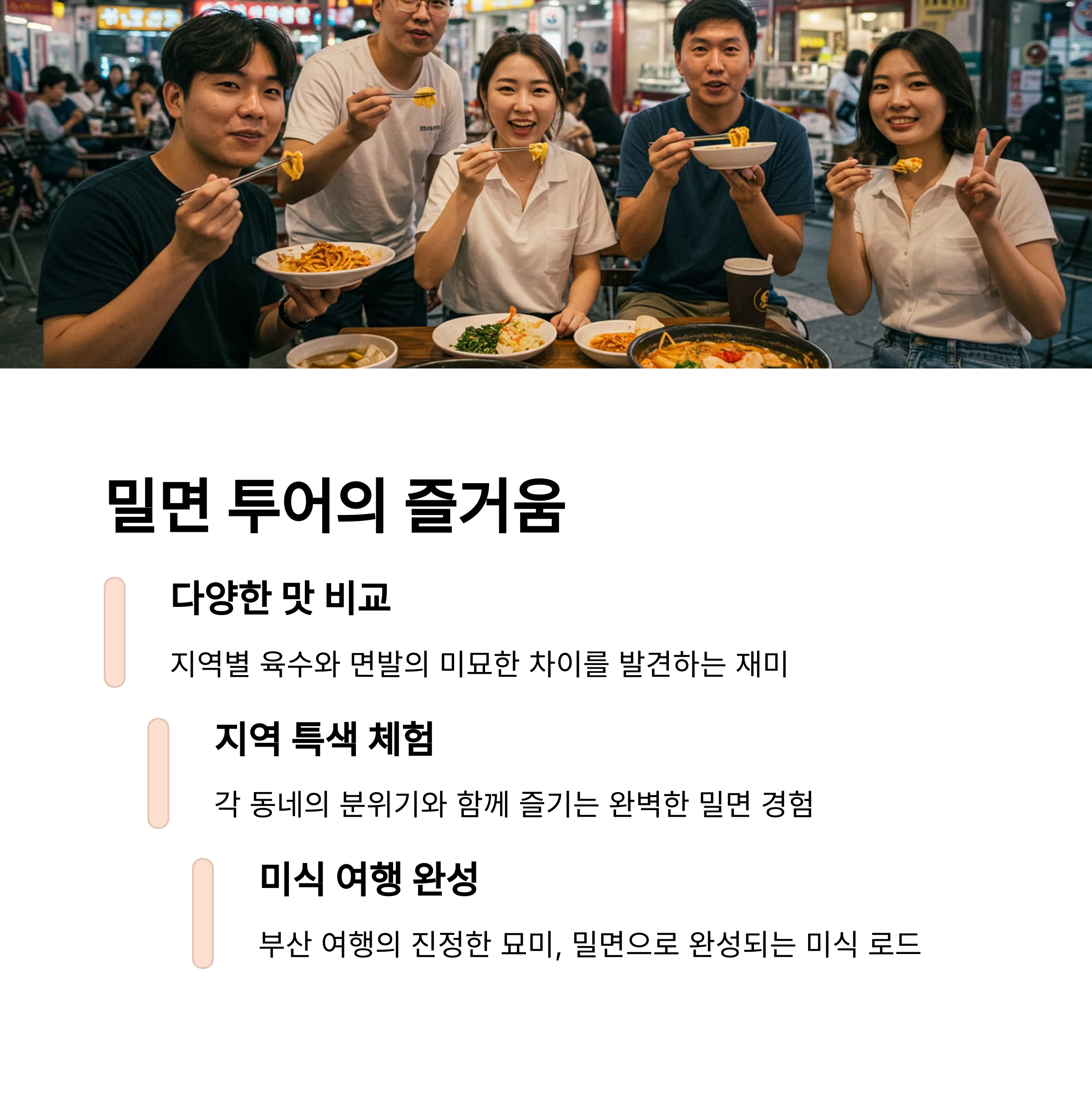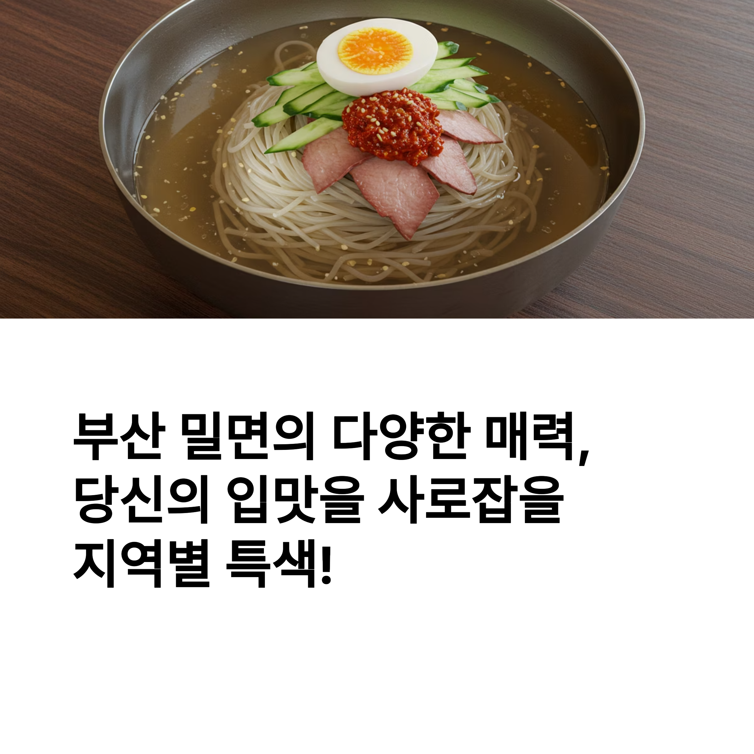 | 밀면이란? | 부산 지역 특색 면 요리로 냉면과 유사하지만 차별화된 맛을 자랑합니다. |