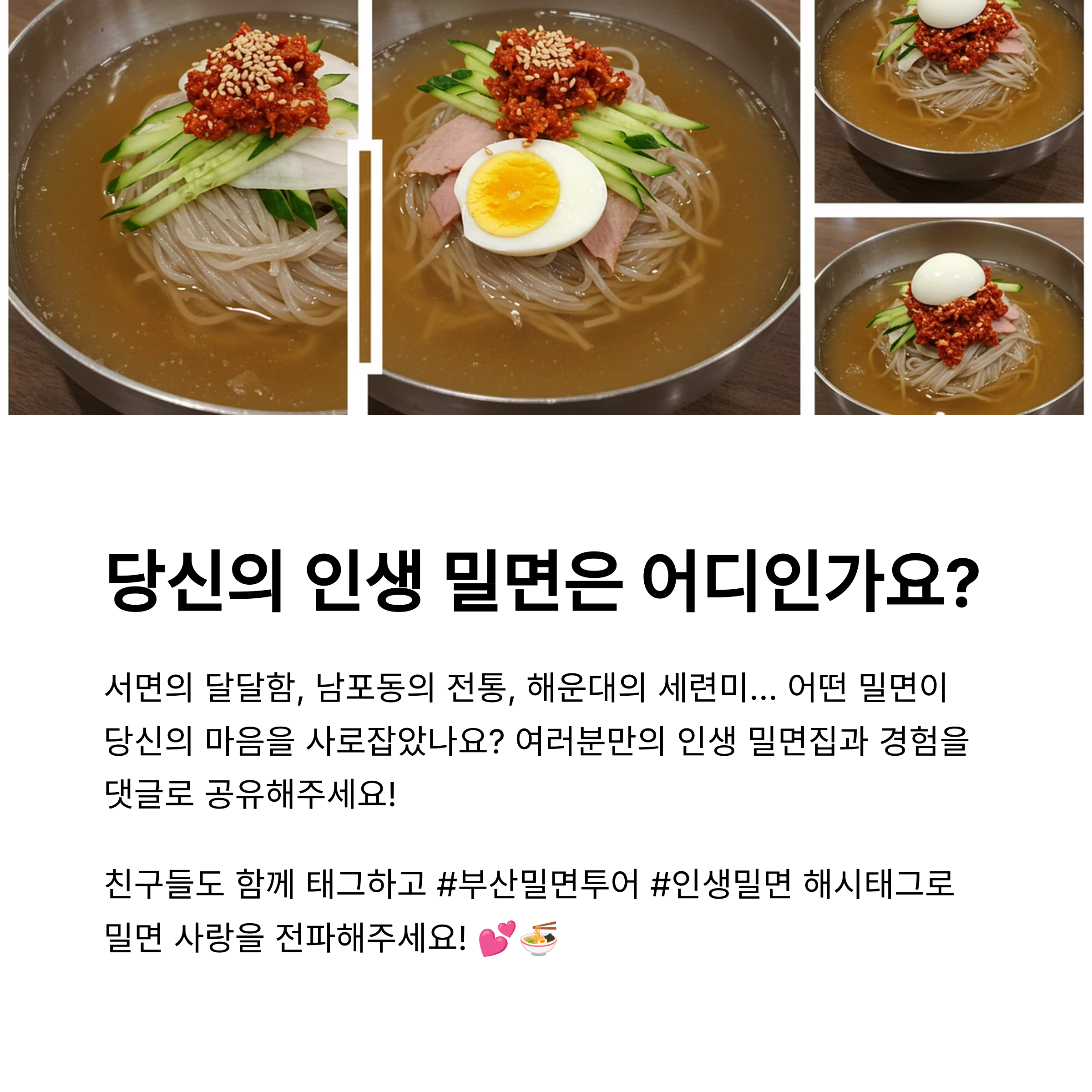 부산의 밀면은 단순한 지역 음식이 아닌, 각각의 동네와 사람들의 이야기, 그리고 역사와 전통이 녹아 있는 특별한 음식 문화입니다. 이번 투어를 통해 느낀 것은 ‘맛있다’는 표현 이상으로 그 안에 담긴 정성과 개성에 감동하게 된다는 점이었습니다. 여름철 시원한 한 끼를 원하신다면, 부산 밀면은 최고의 선택이 될 수 있습니다. 다양한 스타일을 경험해보고 여러분만의 인생 밀면집을 찾는 여정에 도움이 되었길 바랍니다.