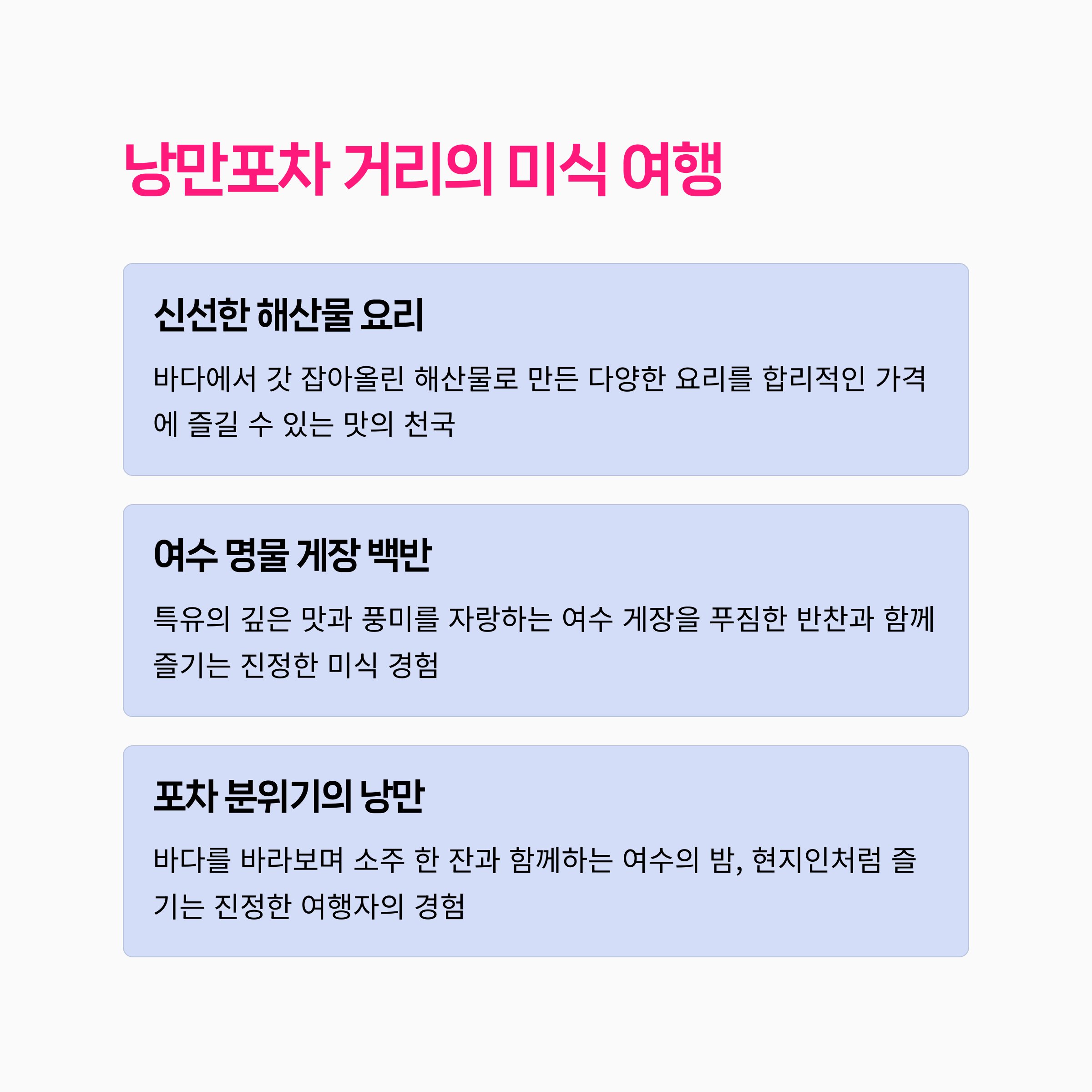 | 인생샷 명소이자 드라이브 코스로도 추천됩니다. | 현지인도 찾는 숨은 맛집이 많아 탐방하는 재미가 있습니다. | 여수 여행에서 빠질 수 없는 포인트 코스입니다. |