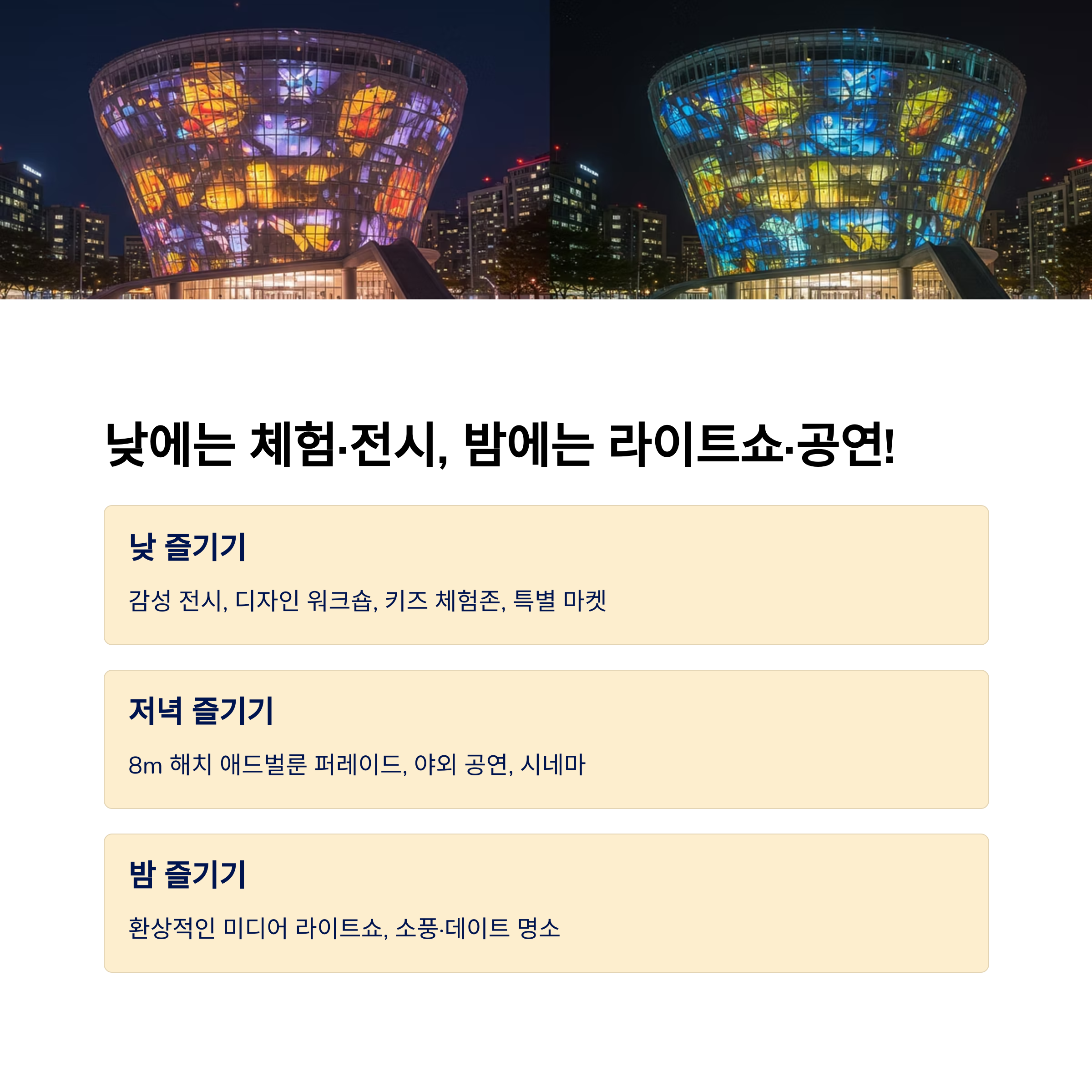 | 동대문역사문화공원역 인근에 위치해 접근성 우수 | 야간 라이트쇼, 체험부스, 디자인 마켓 등 | 가족, 연인, 친구 모두 함께 즐기기 적합 |