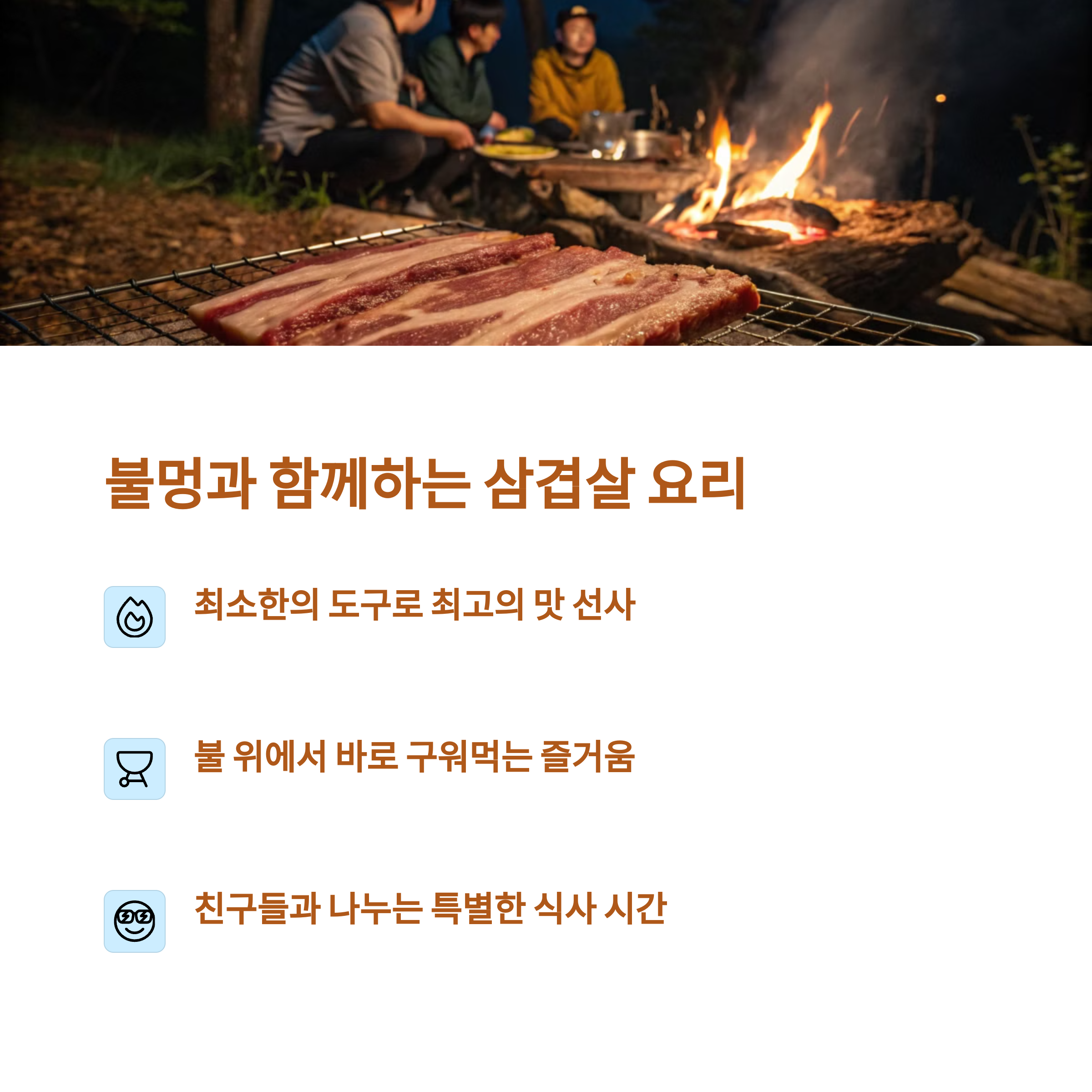 | 따뜻한 조명 아래에서 즐기는 감성 요리 모음 | 불을 바라보며 조리하고 먹는 따뜻한 한 끼 | 불멍 도구, 간단 조리도구, 양념 키트 소개 |