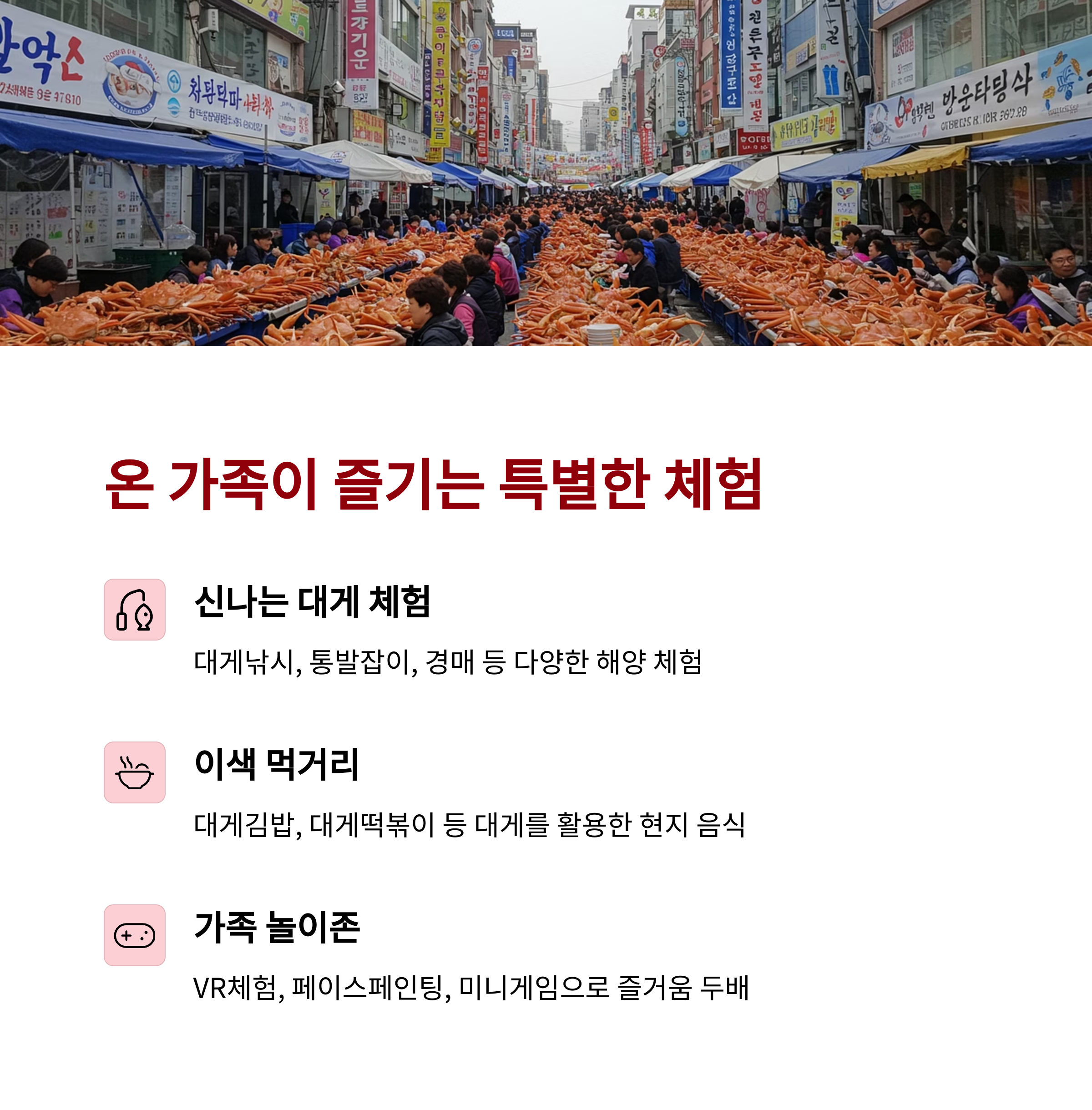 | 대게 요리 체험, 먹거리 장터 다채롭게 구성 | 회, 조개, 문어 등 다양한 해산물 구매 가능 | 온 가족이 즐길 수 있는 체험형 축제 |