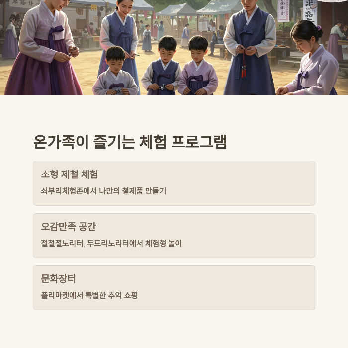 쇠공예 만들기, 작은 제철 체험, 철 조형물 꾸미기 등 아이들이 쉽게 참여하고