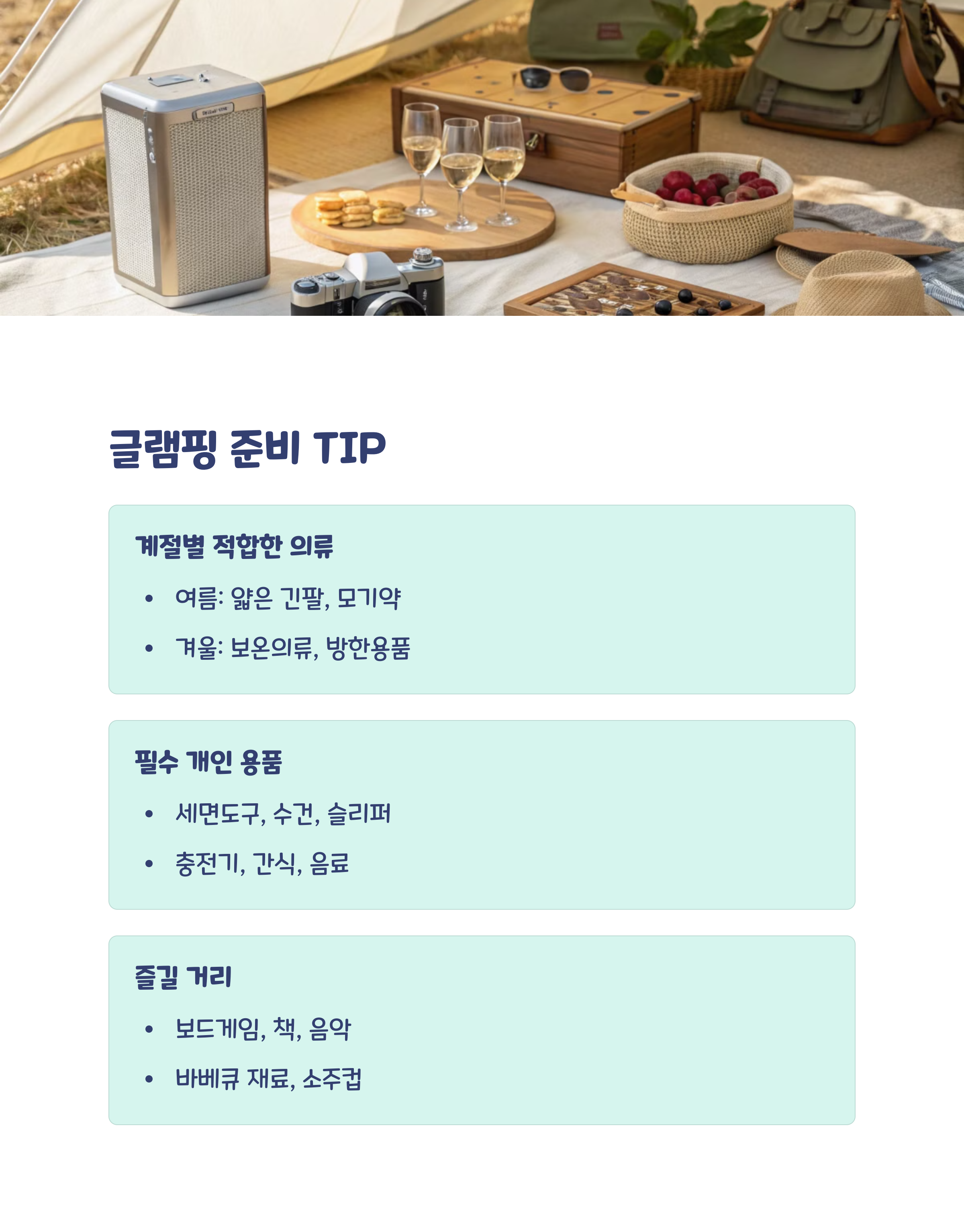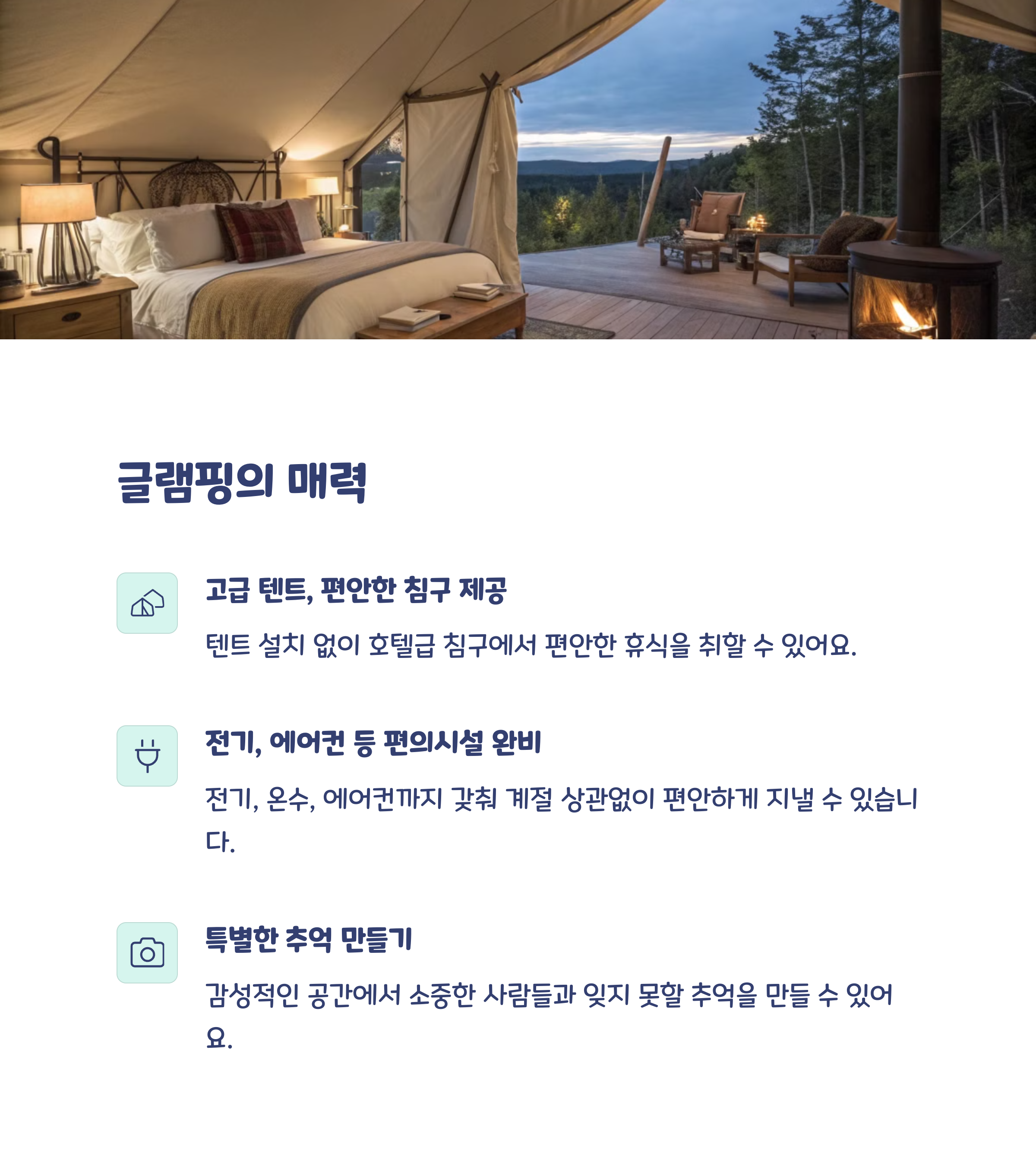 | 글램핑 장점 | 캠핑 장비 없이도 자연 속 힐링 가능 |