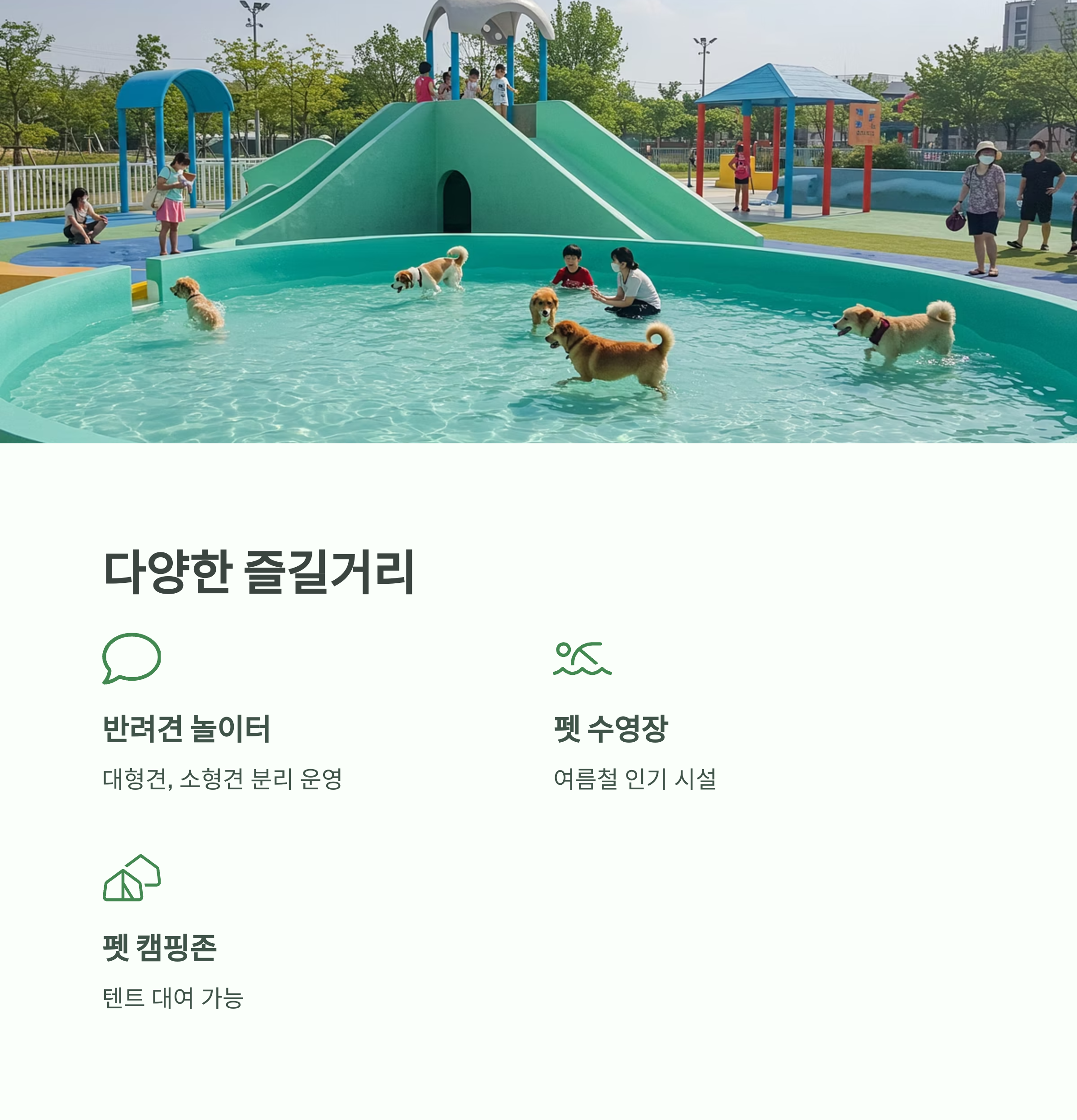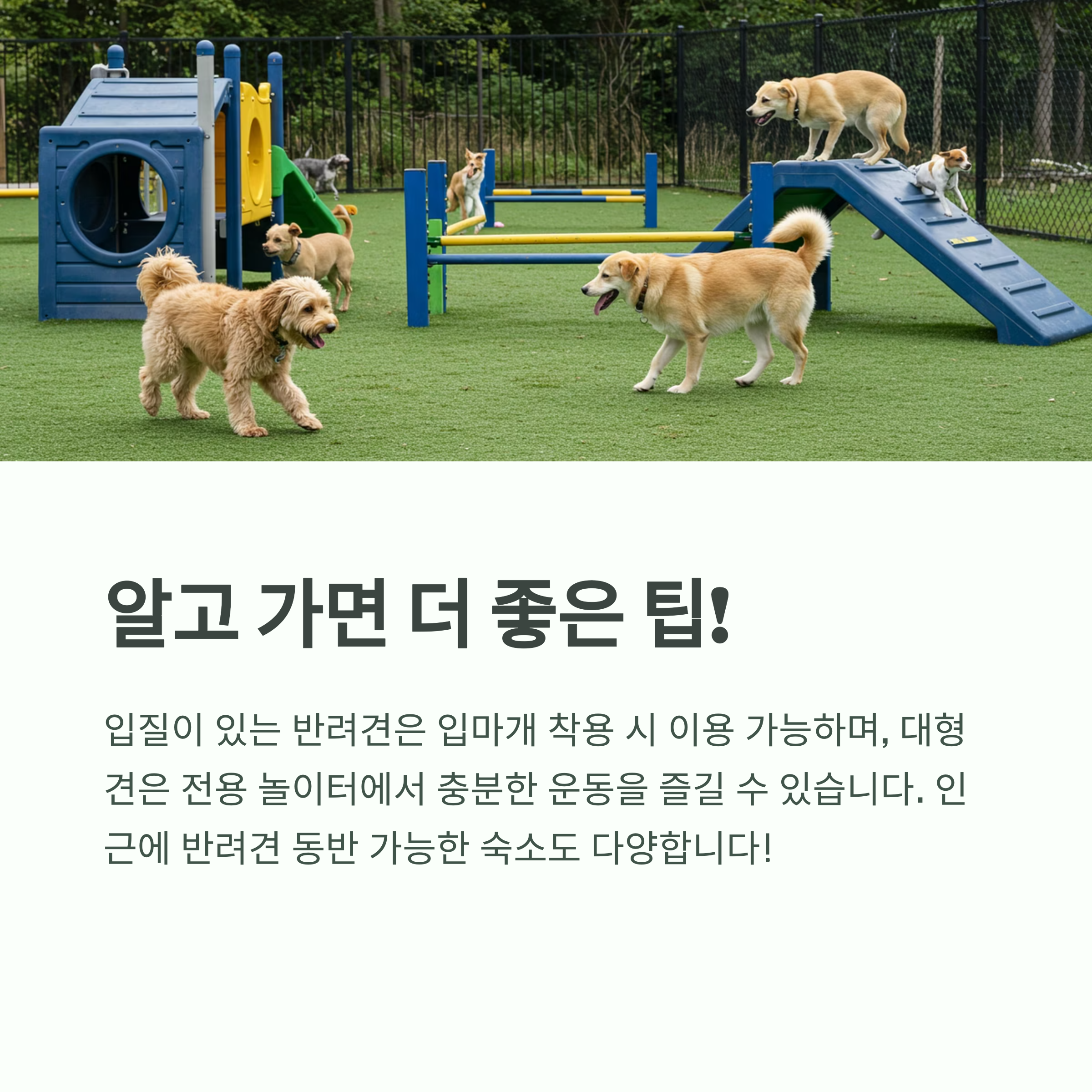 | 반려견 놀이터 | 대형견, 소형견 분리 운영 / 전천후 실내 놀이 가능 |