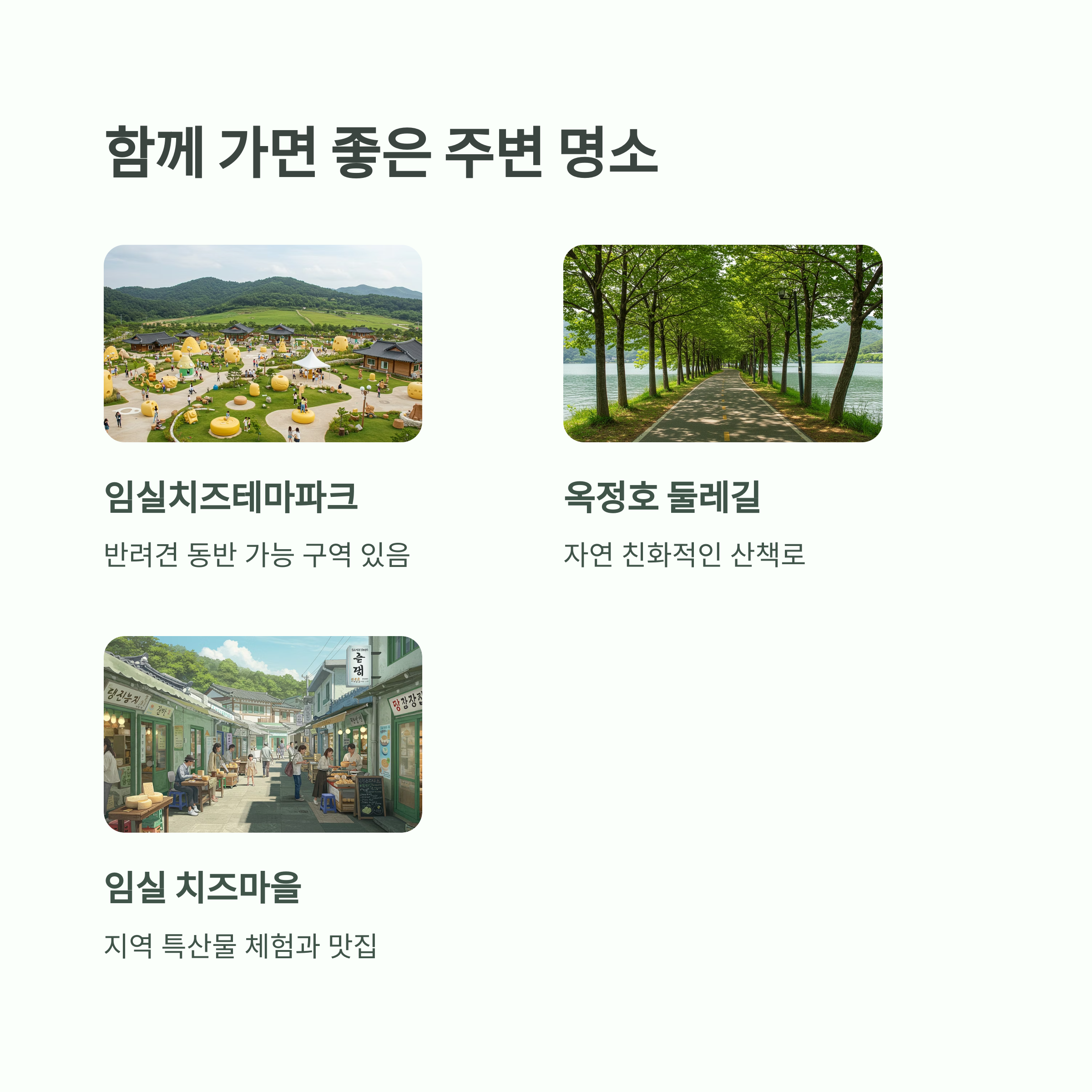 - 임실 치즈마을: 지역 특산물 체험 + 맛집 탐방