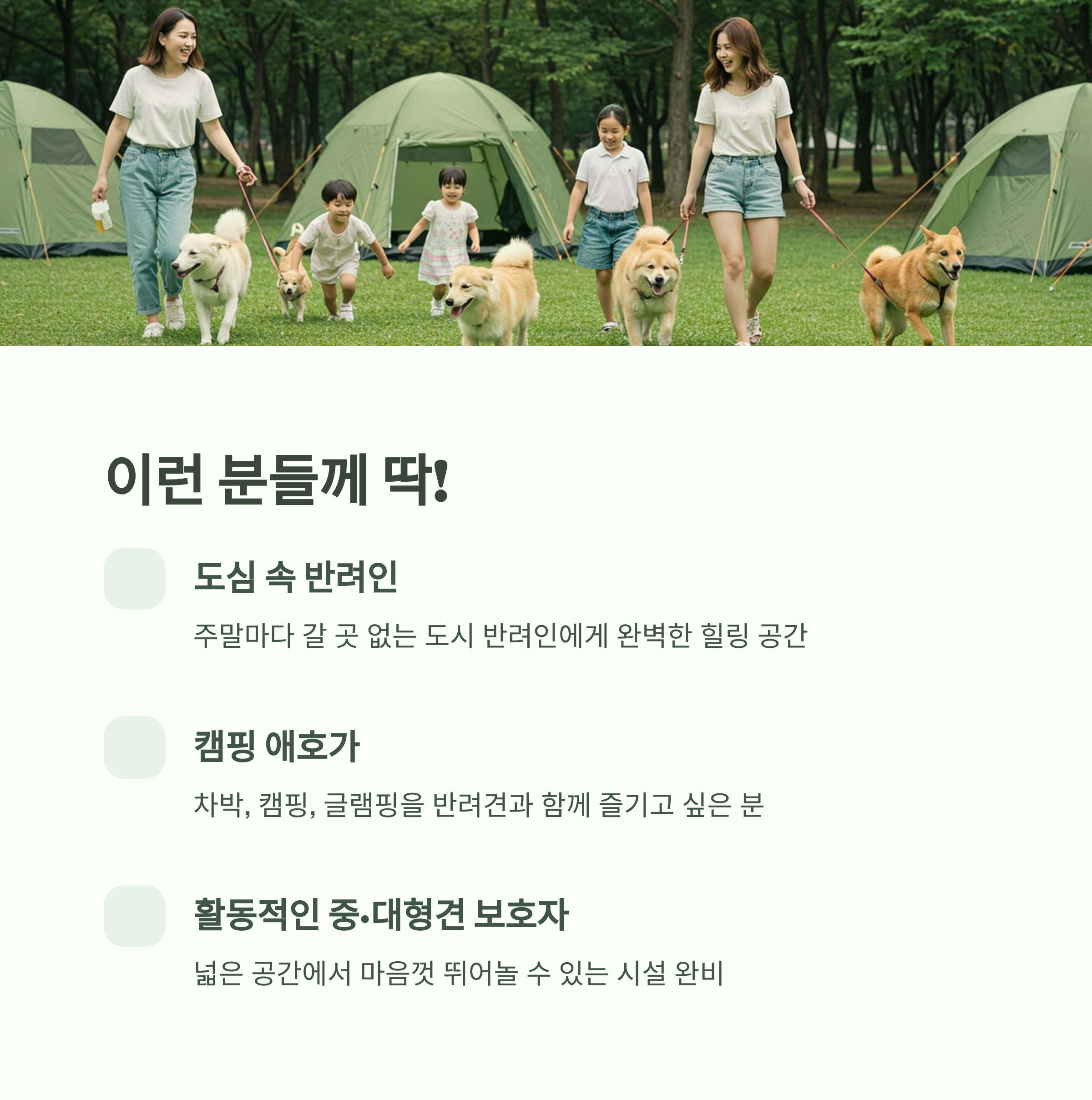 - 가족 단위의 힐링 여행을 계획 중인 반려 가족