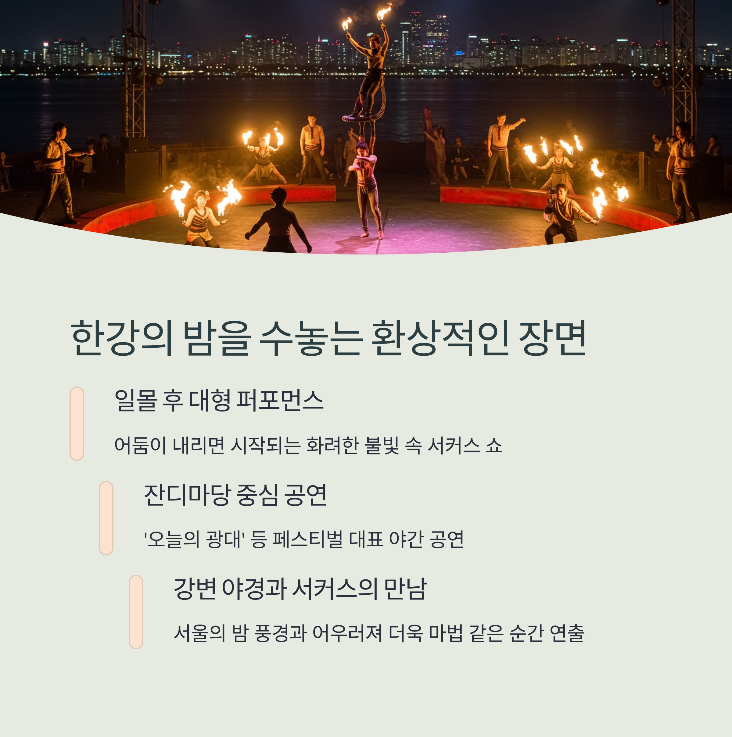한강의 야경과 퍼포먼스가 어우러진 환상적인 무대가 펼쳐집니다.