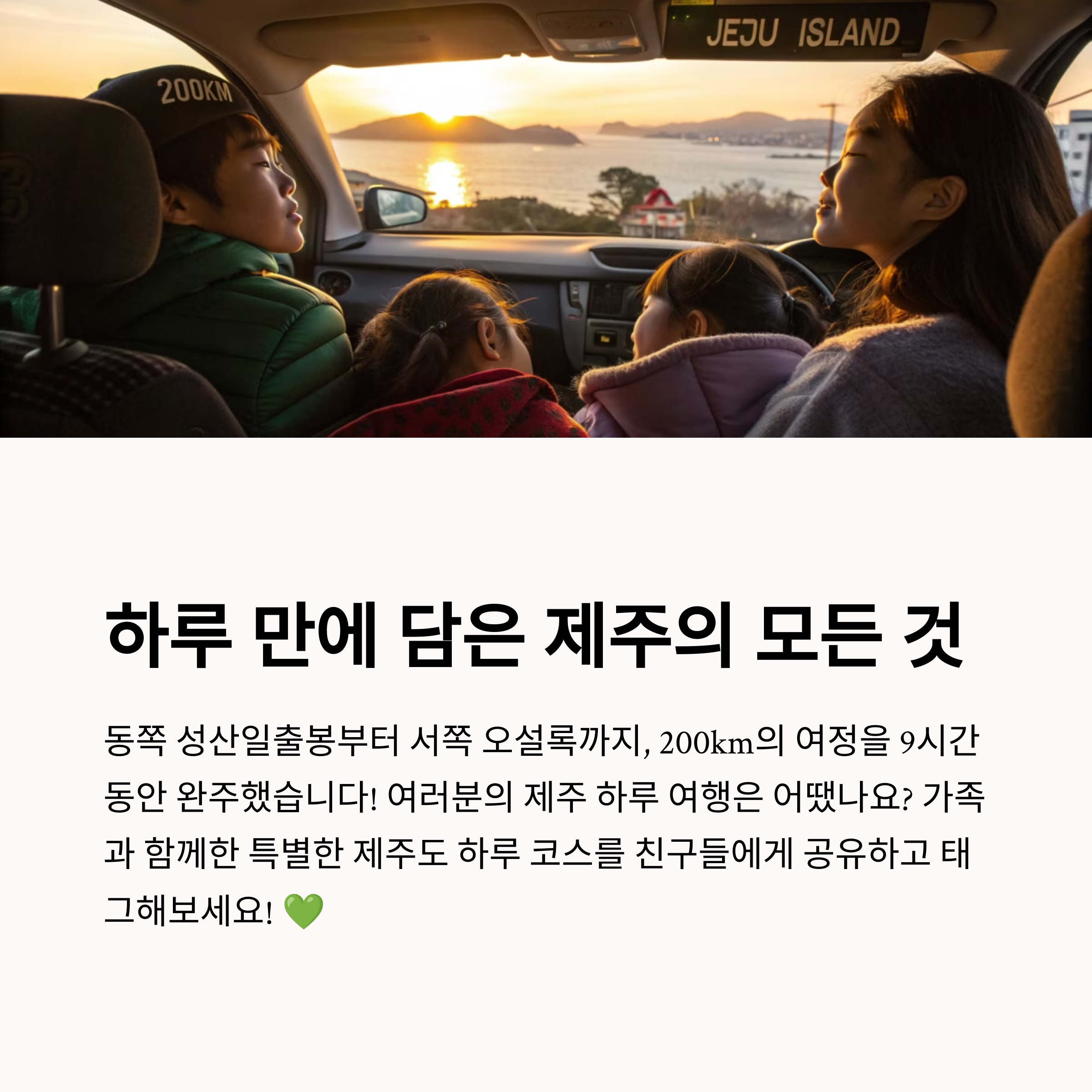 하루라는 시간은 짧지만, 알차게 계획한다면 제주도에서의 여행은 그 무엇보다 풍성할 수 있습니다. 렌터카를 이용하면 아이들과의 이동도 수월하고 체험형 여행지와 맛집을 조화롭게 배치해 지루하지 않은 코스를 만들 수 있습니다. 여행을 떠나기 전 이 글의 코스를 참고하시고 날씨와 컨디션에 맞게 약간씩 조절하면 가족 모두에게 기억에 남는 제주 여행이 될 거예요. 바쁜 일정 속에서도 자연과 여유를 동시에 느낄 수 있는 하루 코스, 꼭 한 번 실천해보시길 추천드립니다.