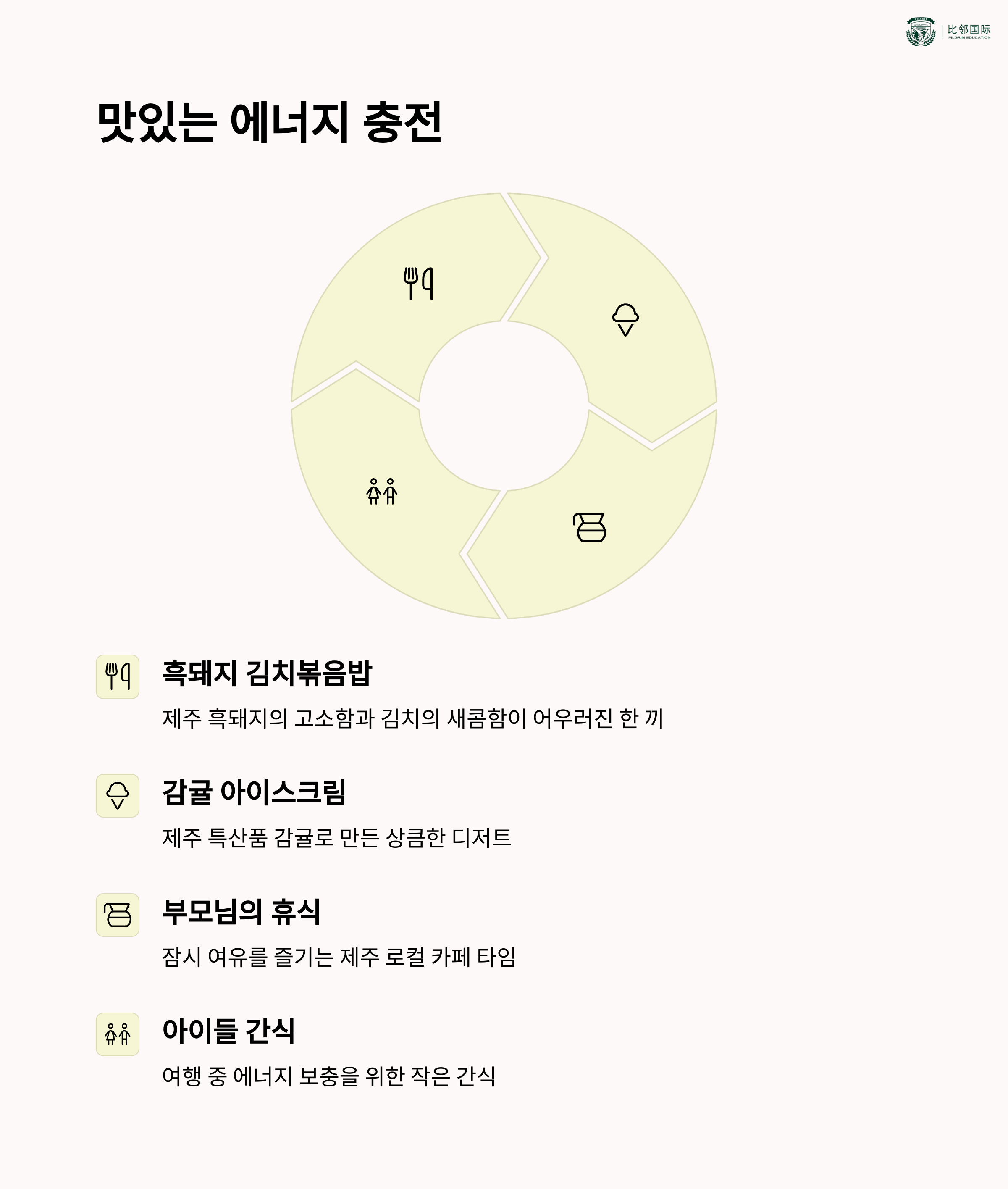 오전 일정은 최대한 가볍고 재미있게 구성하는 것이 중요합니다. 아이들과 함께라면 체험형 장소가 필요하죠. 섭지코지에서 승마 체험을 하거나 해녀박물관에서 전통 문화를 접하는 것도 추천됩니다. 오후에는 자연 경관을 감상하며 쉬어갈 수 있는 산방산 근처의 해안도로 드라이브를 해보세요. 바다를 배경으로 사진도 찍고, 아이들은 넓은 잔디밭에서 자유롭게 뛰어놀 수 있어 가족 모두가 만족하는 시간을 보낼 수 있습니다.